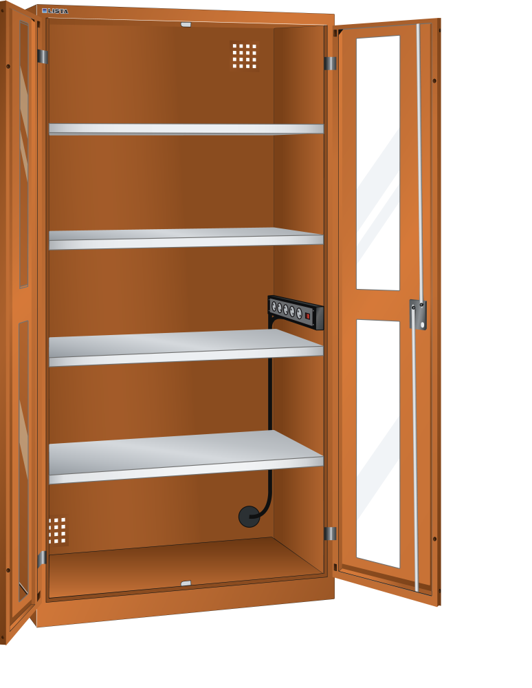 Akku-Ladeschränke mit Flügeltüren: Die Schränke sind je nach Modell ausgestattet mit: Verstellböden verzinkt, 30 mm stark, Tragkraft 60 kg. Schubladen lackiert, Anthrazitgrau (RAL 7016), Tragkraft 50 kg. Energieleisten mit Ein-/Aus-Schalter und 4 bzw. 5 Steckdosen 230 V.