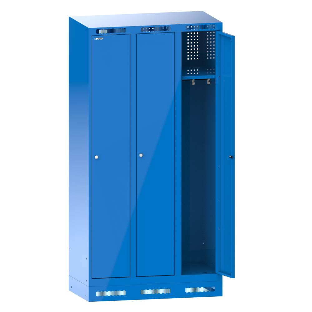 Akku-Ladeschrank mit Garderoben (BxTxH) 900x585x1800mm 3 Abteile mit Sockel, Türen glatt Typ CH 2x230V KEY Lock Himmelblau RAL 5015