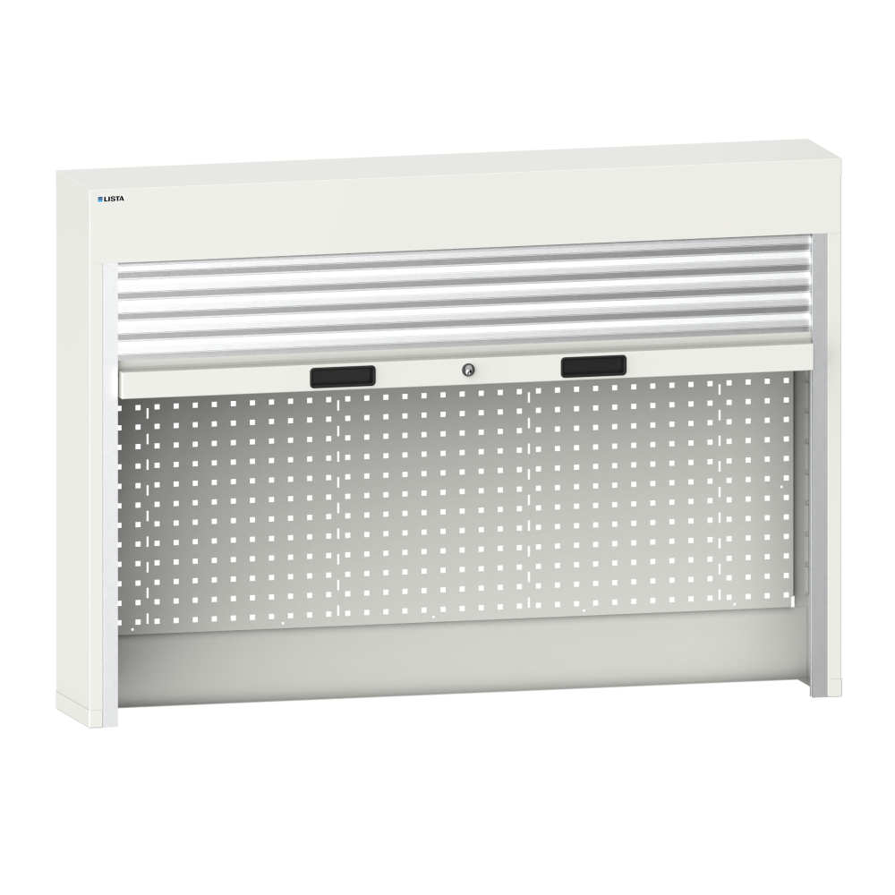 Aufsatzschränke mit Rollladen: Aufsatzschränke ohne Gehäuseboden für die direkte Montage auf der Werkbankplatte. Rollladen aus Aluminium-Lamellen und Federzug-Aufwicklung, Farbe ähnlich Weissaluminium RAL 9006. Griffleiste mit integrierten Griffschalen und Schliessmechanik KEY Lock. Kraftschonende und sichere (Eigenhemmung) Bedienung. Inkl. integrierter Lochrückwand mit 4-kant Lochung 10x10 und Teilung 38 mm. Optional: Verstellböden im 25 mm Raster höhenverstellbar. Kabelkanal für den Einsatz der Energiemodule. Punch-out für allfällige Elektrifizierung und Befestigungsmöglichkeiten für Energieleisten und LED Leuchten. Ausführung: Stahlblech. Farbe: gemäss Farbkarte.