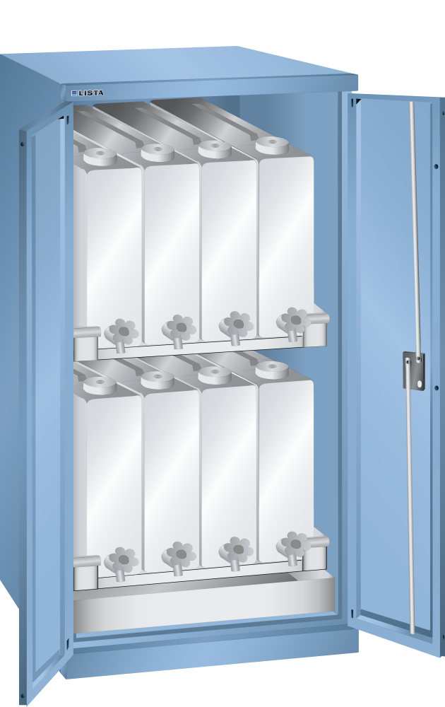 Flüssigkeitsschränke: Die Schränke sind ausgestattet mit: Auffangwannen Chromstahl, 2 mm stark, flüssigkeitsdicht verschweisst gemäss Wasserhaushaltsgesetz § 19 / StawaR, Fassungsvolumen 40 Liter, Kannenböden lackiert Grau, NCS 4502-B, Kanister aus HDPE-Kunststoff mit Ausgusshahn glanzverchromt. Vollblech-Flügeltüren aus einem Stück gekantet, mit Drehbolzen, Öffnungswinkel 235 Grad.