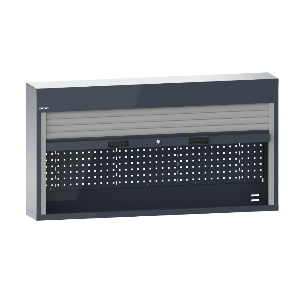 Hängeschränke mit Rollladen: Für Tragsäulenmontage. Rollladen aus Aluminium-Lamellen und Federzug-Aufwicklung, Farbe ähnlich Weissaluminium RAL 9006. Griffleiste mit integrierten Griffschalen und Schliessmechanik KEY Lock. Kraftschonende und sichere (Eigenhemmung) Bedienung. Inkl. integrierter Lochrückwand mit 4-kant Lochung 10x10 und Teilung 38 mm. Optional: Verstellböden im 25 mm Raster höhenverstellbar. Kabelkanal für den Einsatz der Energiemodule. Punch-out für allfällige Elektrifizierung und Befestigungsmöglichkeiten für Energieleisten und LED Leuchten. Ausführung: Stahlblech. Farbe: gemäss Farbkarte.