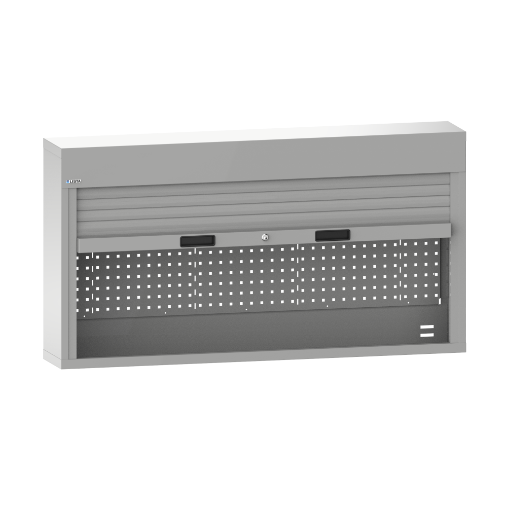 Hängeschränke mit Rollladen: Für Tragsäulenmontage. Rollladen aus Aluminium-Lamellen und Federzug-Aufwicklung, Farbe ähnlich Weissaluminium RAL 9006. Griffleiste mit integrierten Griffschalen und Schliessmechanik KEY Lock. Kraftschonende und sichere (Eigenhemmung) Bedienung. Inkl. integrierter Lochrückwand mit 4-kant Lochung 10x10 und Teilung 38 mm. Optional: Verstellböden im 25 mm Raster höhenverstellbar. Kabelkanal für den Einsatz der Energiemodule. Punch-out für allfällige Elektrifizierung und Befestigungsmöglichkeiten für Energieleisten und LED Leuchten. Ausführung: Stahlblech. Farbe: gemäss Farbkarte.