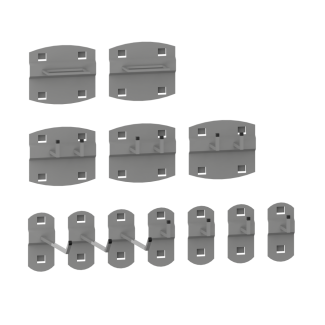 Die Lochplattenhaken sind mittels beiliegendem Befestigungsmaterial zu arretieren. Farbe der Halter: Weissaluminium, RAL 9006. Tragkraft pro Lochplattenhaken max. 5 kg.