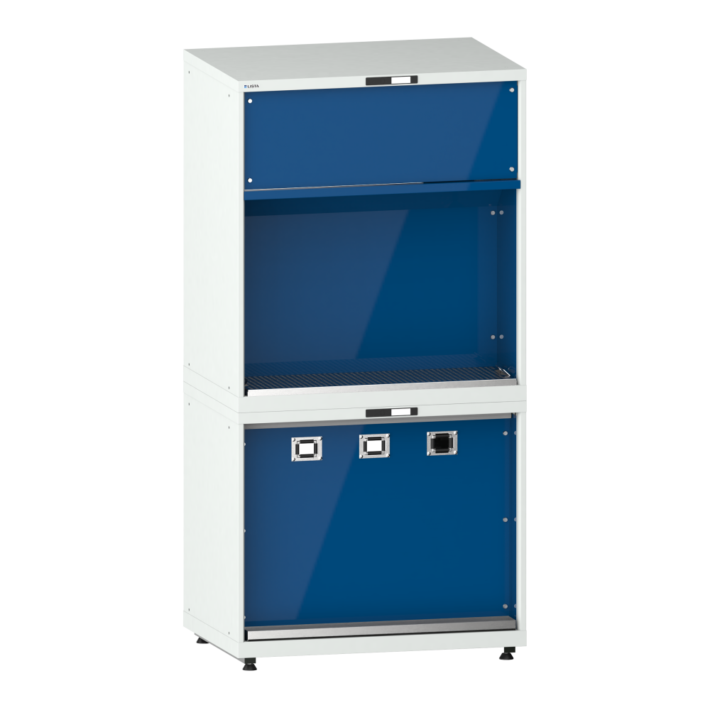 Medienversorgungs-Tower 54x36E (BxTxH) 1023x725x2045-2090mm 6 x Schlauchtor/2 x Tropfwanne inkl. Nivellierfuss-Set für Blenden (4 x Füsse, 45-90mm) und Montagesatz Lichtgrau RAL 7035 / Signalblau RAL 5005