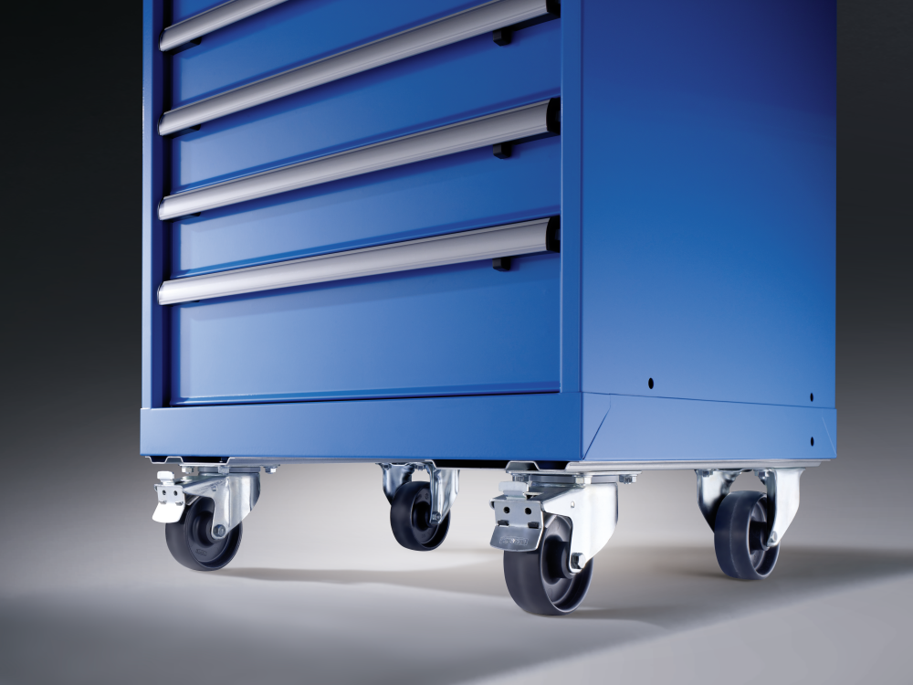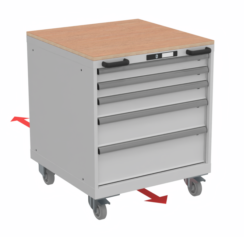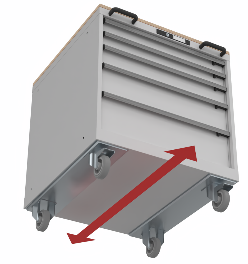 Fahrbare Schubladenschränke müssen aus Sicherheitsgründen eine Schiebestange sowie eine Schubladen-Einzelsicherung besitzen.