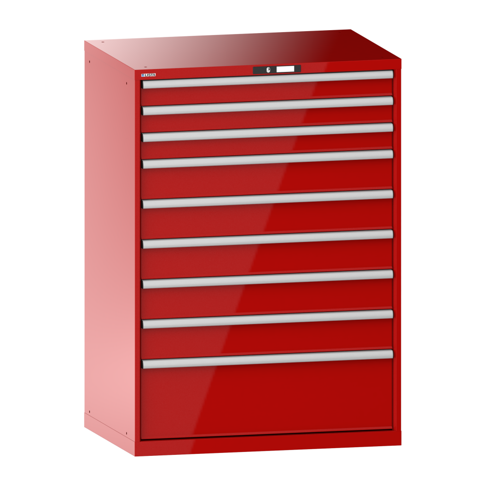 Schubladenschrank 54x36E (BxTxH) 1023x725x1450mm 9 Schubladen (3x100/5x150/1x300) 200kg KEY Lock Feuerrot RAL 3000