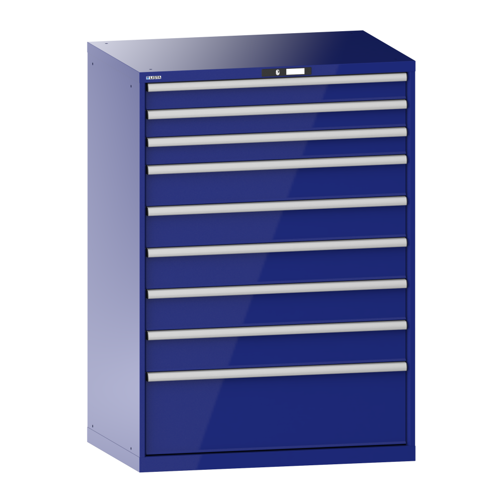 Schubladenschrank 54x36E (BxTxH) 1023x725x1450mm 9 Schubladen (3x100/5x150/1x300) 200kg KEY Lock Ultramarinblau RAL 5002