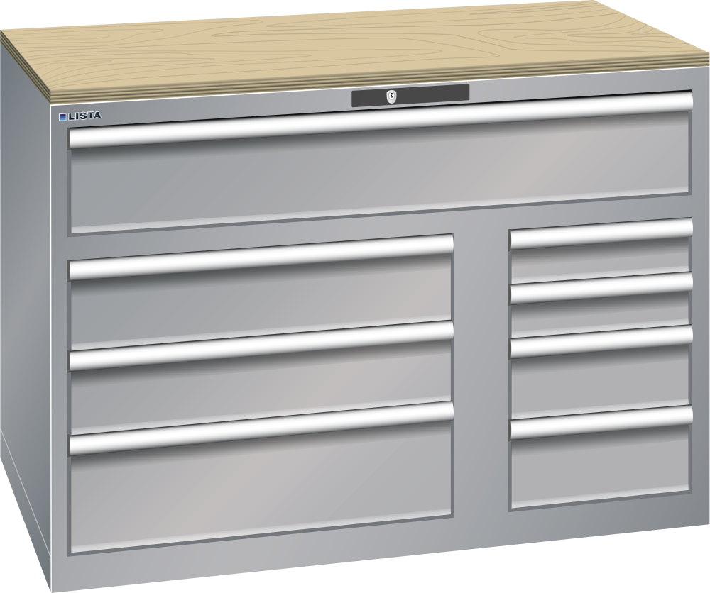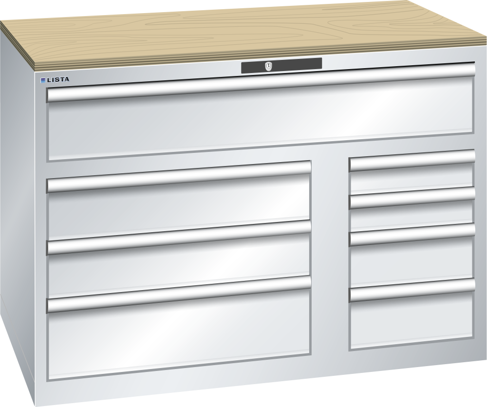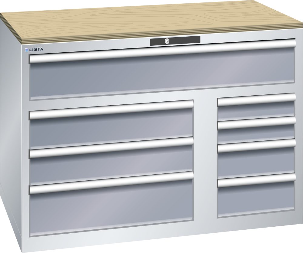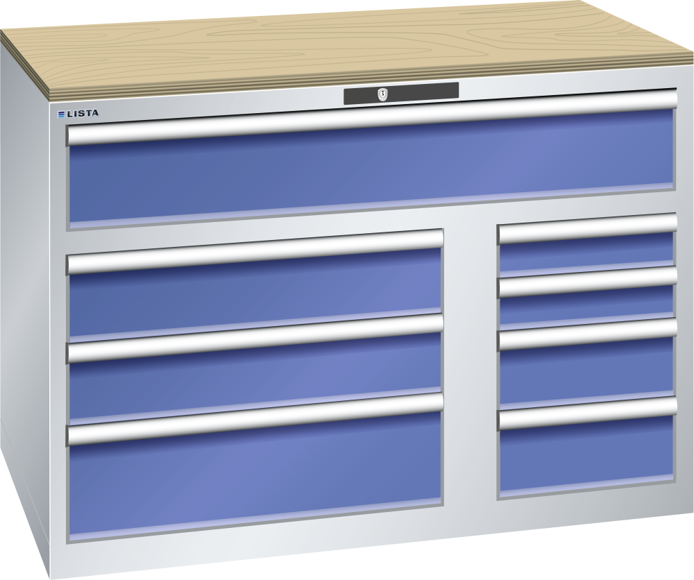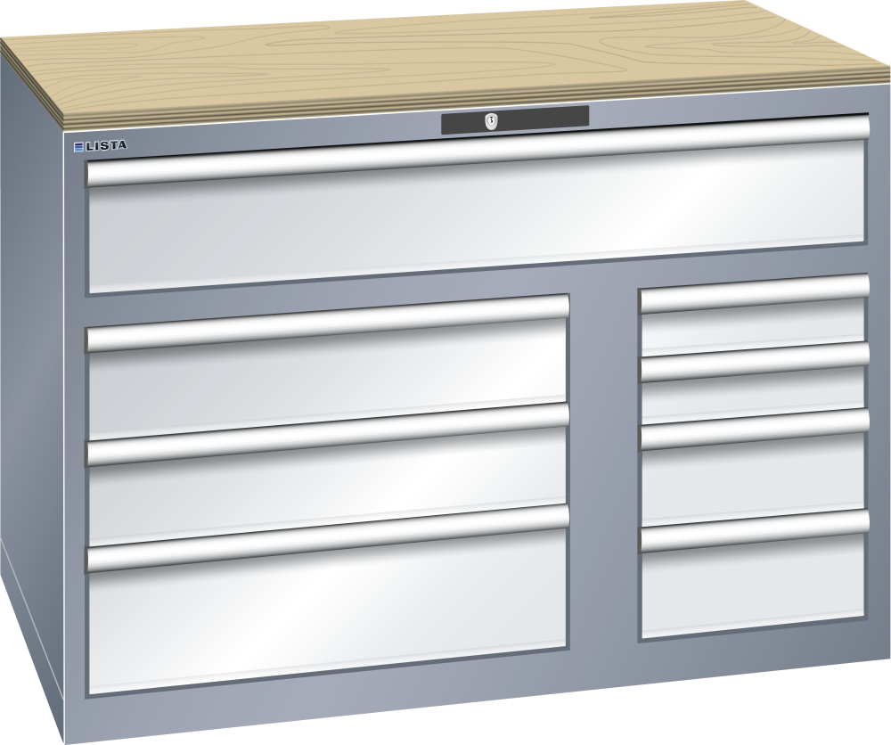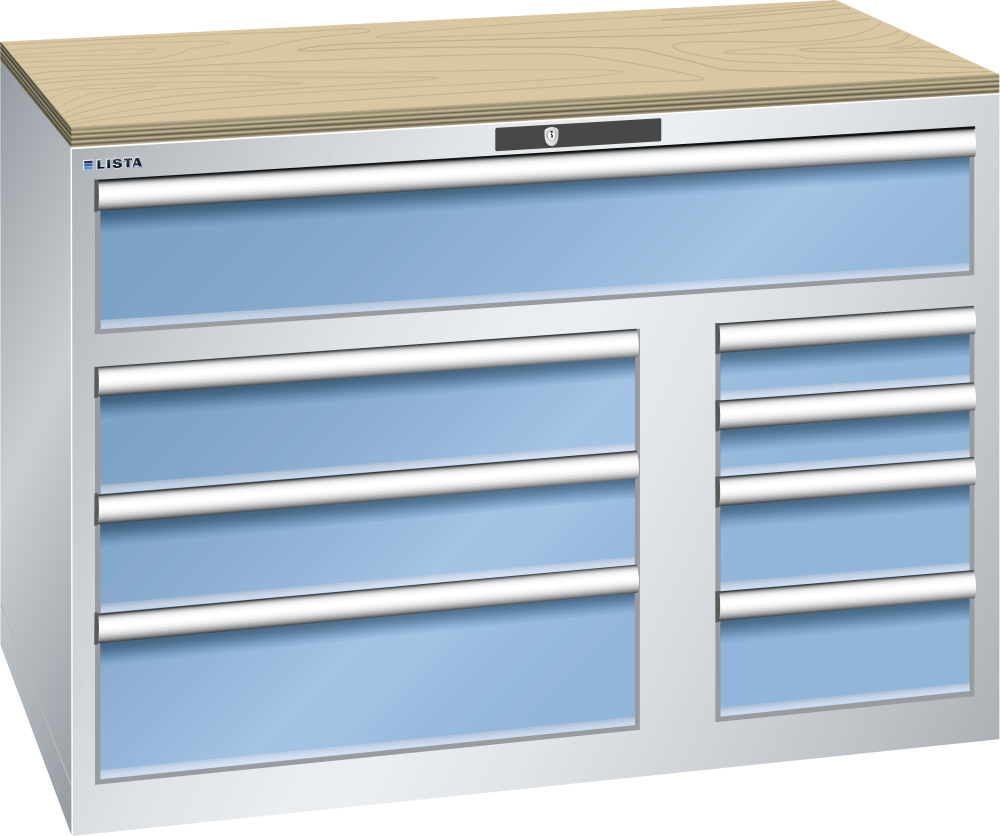 Toolbox: Kombinierte Schubladenbreiten in einem Gehäuse bzw. Schubladenschrank. 3 Abteile mit Schubladen oben 64E, unten links 36E und unten rechts 18 E. Inkl. Zentralverschluss für alle Schubladen gleichzeitig verschliessbar.