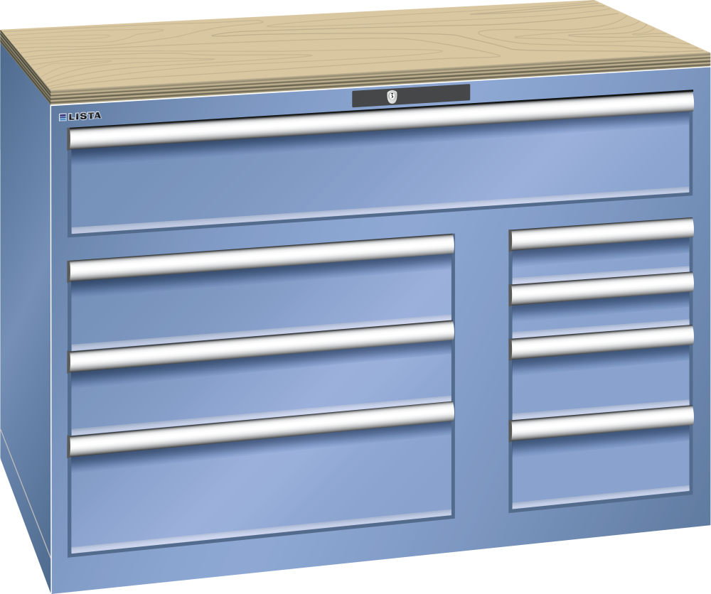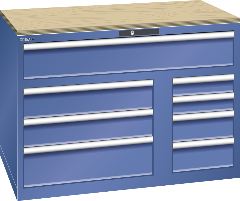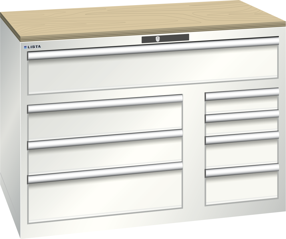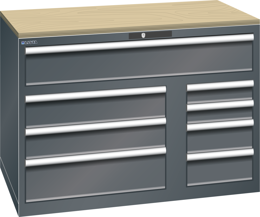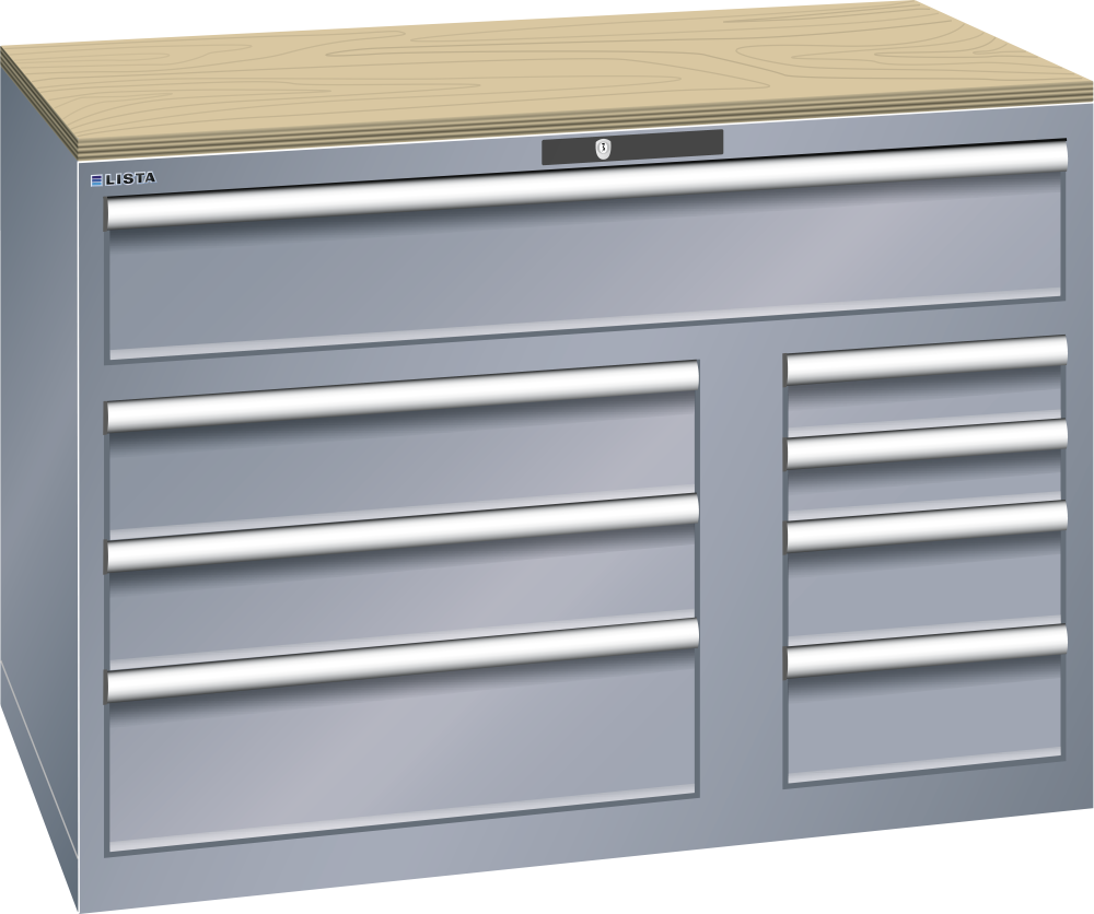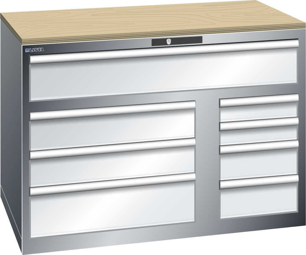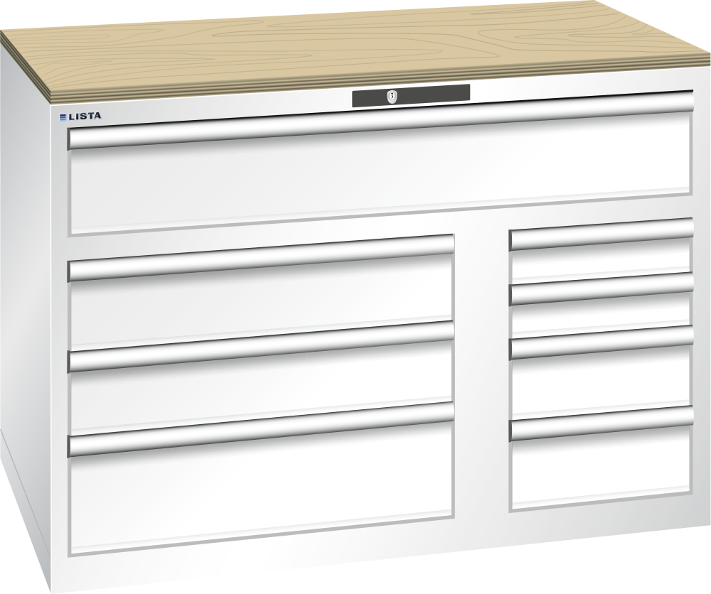 Toolbox: Kombinierte Schubladenbreiten in einem Gehäuse bzw. Schubladenschrank. 3 Abteile mit Schubladen oben 64E, unten links 36E und unten rechts 18 E. Inkl. Zentralverschluss für alle Schubladen gleichzeitig verschliessbar.
