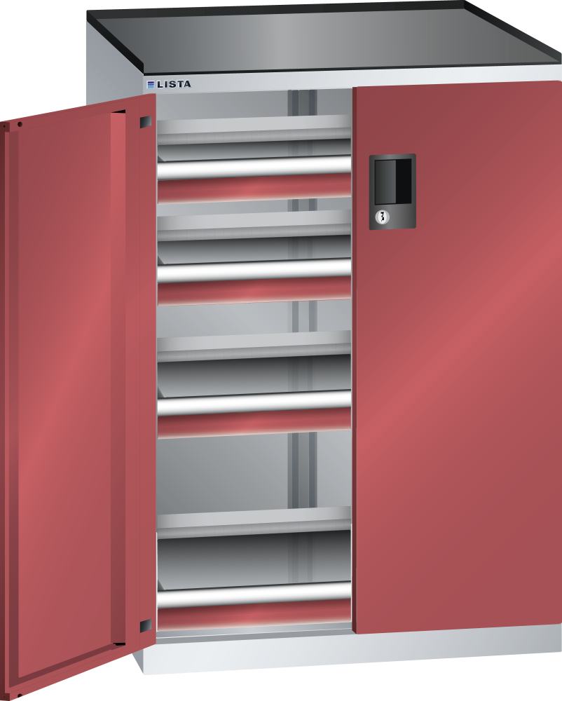 Schubladenschrank mit Flügeltüren 36x27E (BxTxH) 717x600x1020mm 4 Schubladen (200kg) RFID Lock Lichtgrau RAL 7035 / Rubinrot RAL 3003