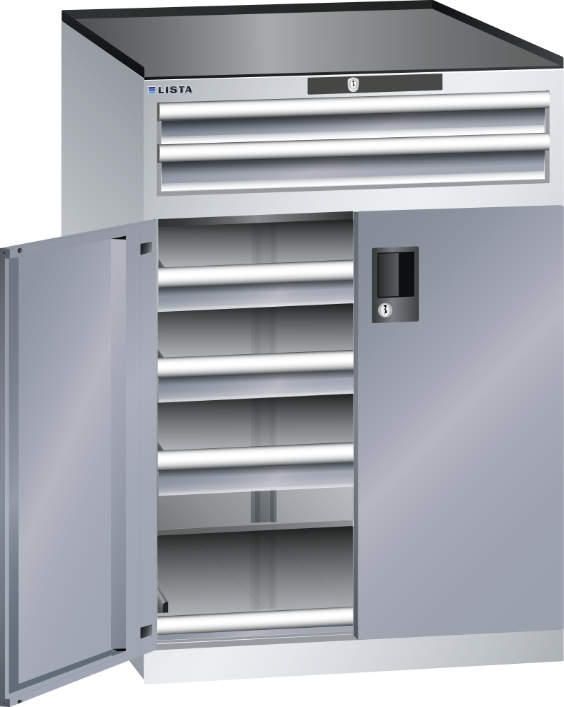 Flügeltüren: Die Flügeltüren aus Stahlblech besitzen einen 2-Punkt-Stangen-Verschluss und können wahlweise mit den Schliesssystemen KEY Lock, CODE Lock oder RFID Lock versehen werden. Der maximale Öffnungswinkel beträgt 235 Grad.