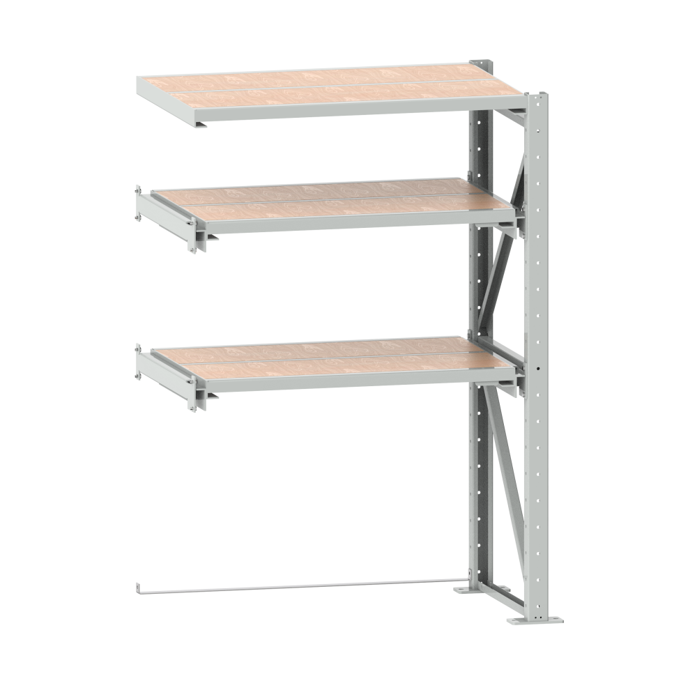 Schwerlast-Auszugregale, zerlegt: Mit 2 Auszugrahmen für Einfachauszug (EA, 65 % ausziehbar) sowie 1 Festrahmen als Kopfboden, jeweils inklusive Spanplatteneinlagen, 40 mm stark. Beliebig mit Seitenwänden, weiteren Auszug- und Festrahmen, Abdeckungen, Schiebetüren, Rollladen und Anfahrschutz ausstattbar. Grundfeld inklusive 1 Diagonalkreuz zur Längsstabilisierung, 2 Ständerrahmen, Bodenverankerung und Nivellierplatten-Set. Anbaufeld inklusive 1 Ständerrahmen, Bodenverankerung und Nivellierplatten-Set. Lochteilung im Ständerrahmen alle 100 mm. Ausführung: Stahlblech. Farbe: gemäss Farbkarte. Hinweis: Ab dem 3. Anbaufeld wird ein zusätzliches Diagonalkreuz benötigt.