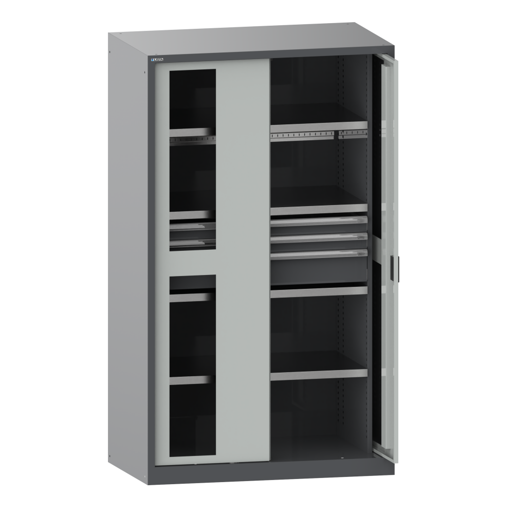 Schwerlastschränke mit Einschwenktüren: Die Schränke sind ausgestattet mit: Verstellböden verzinkt, 33 mm stark, Auszugböden und Schubladen lackiert generell Grau, NCS 4502-B. Einschwenktüren aus einem Stück gekantet, wahlweise aus Vollblech oder mit Sichtfenstern. In Scharnierbügel gelagert, Schwenkbereich 90 Grad, der Überstand der Türen im offenen Zustand beträgt 85 mm. Eine Kippsicherung wird durch die Einzelschubladensperre gewährleistet. Schliessungen KEY Lock, CODE Lock oder RFID Lock möglich.