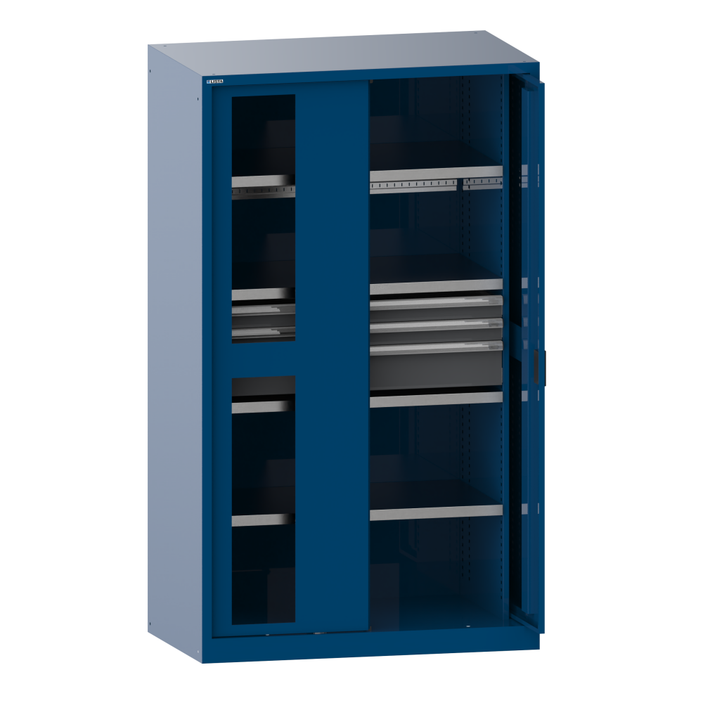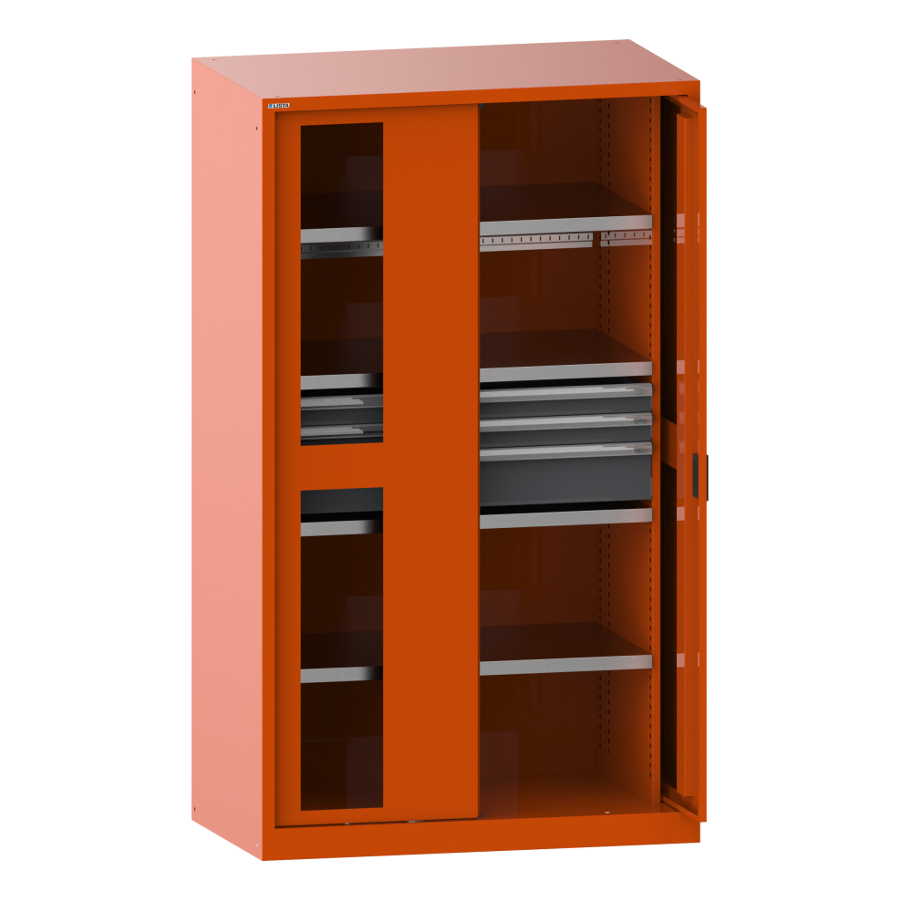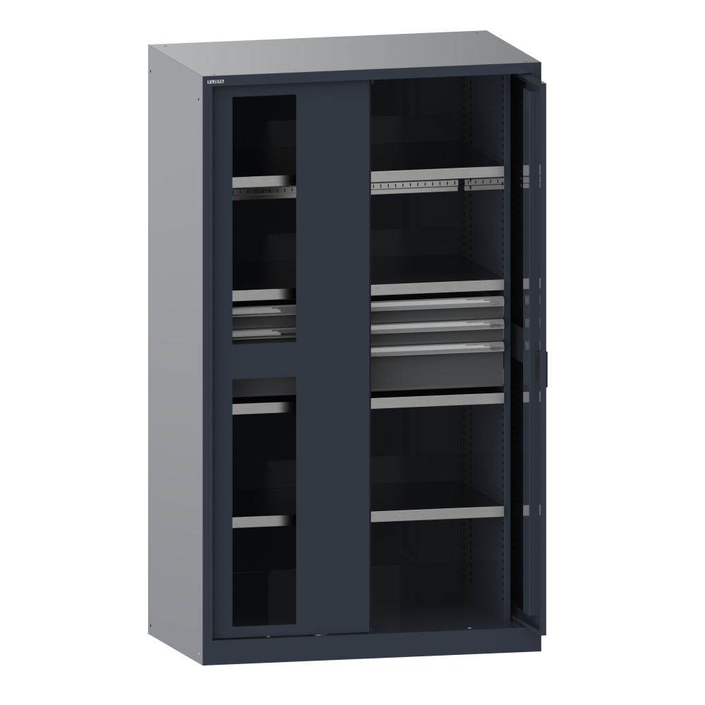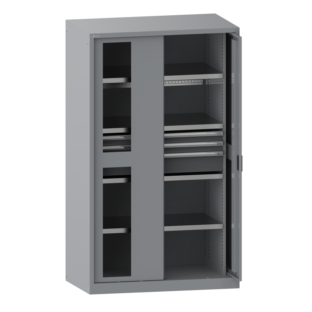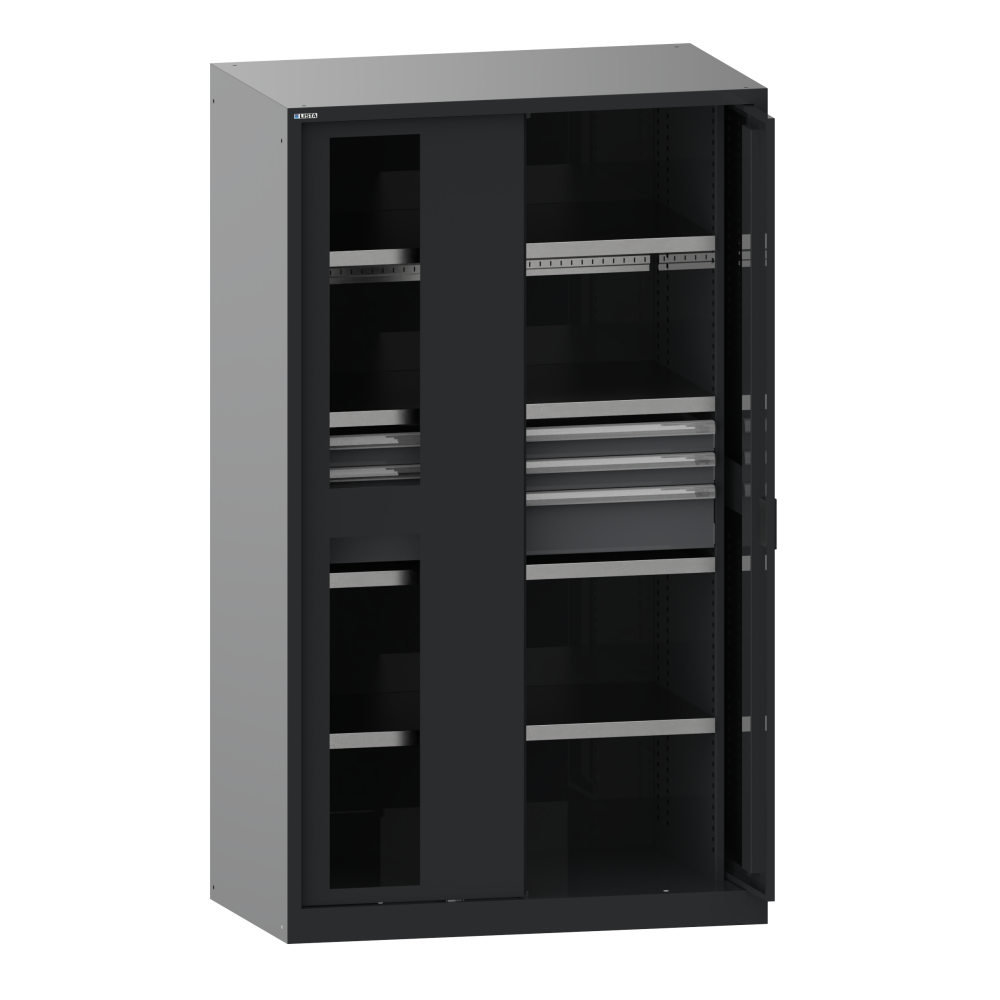Schwerlastschränke mit Einschwenktüren: Die Schränke sind ausgestattet mit: Verstellböden verzinkt, 33 mm stark, Auszugböden und Schubladen lackiert generell Grau, NCS 4502-B. Einschwenktüren aus einem Stück gekantet, wahlweise aus Vollblech oder mit Sichtfenstern. In Scharnierbügel gelagert, Schwenkbereich 90 Grad, der Überstand der Türen im offenen Zustand beträgt 85 mm. Eine Kippsicherung wird durch die Einzelschubladensperre gewährleistet. Schliessungen KEY Lock, CODE Lock oder RFID Lock möglich.