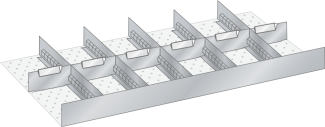 Schlitzwände beidseitig: Für Längs- und Querteilung der Schubladen. Schlitzraster wie bei den Schubladenwänden in Einheiten von 17 mm. Die untere Abkantung ermöglicht ein Verschrauben der Schlitzwände mit dem gelochten Schubladen-Boden. Ausführung: Stahlblech, inklusive Verschraubungsmaterial. Farbe: Grau, NCS S 4502-B.