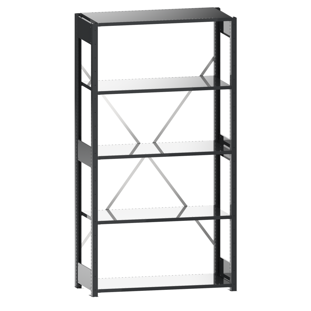 2 Regalstützenpaare inkl. 6 Tiefenstreben, 1 Diagonalkreuz verzinkt, Fachböden geschlitzt (Stärke 25 mm)