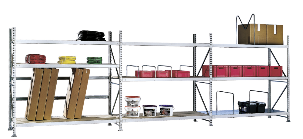 Weitspannregale: Schraubmontage. Ausführung: verzinkt, mit Stahlpaneelen oder Spanplatten.