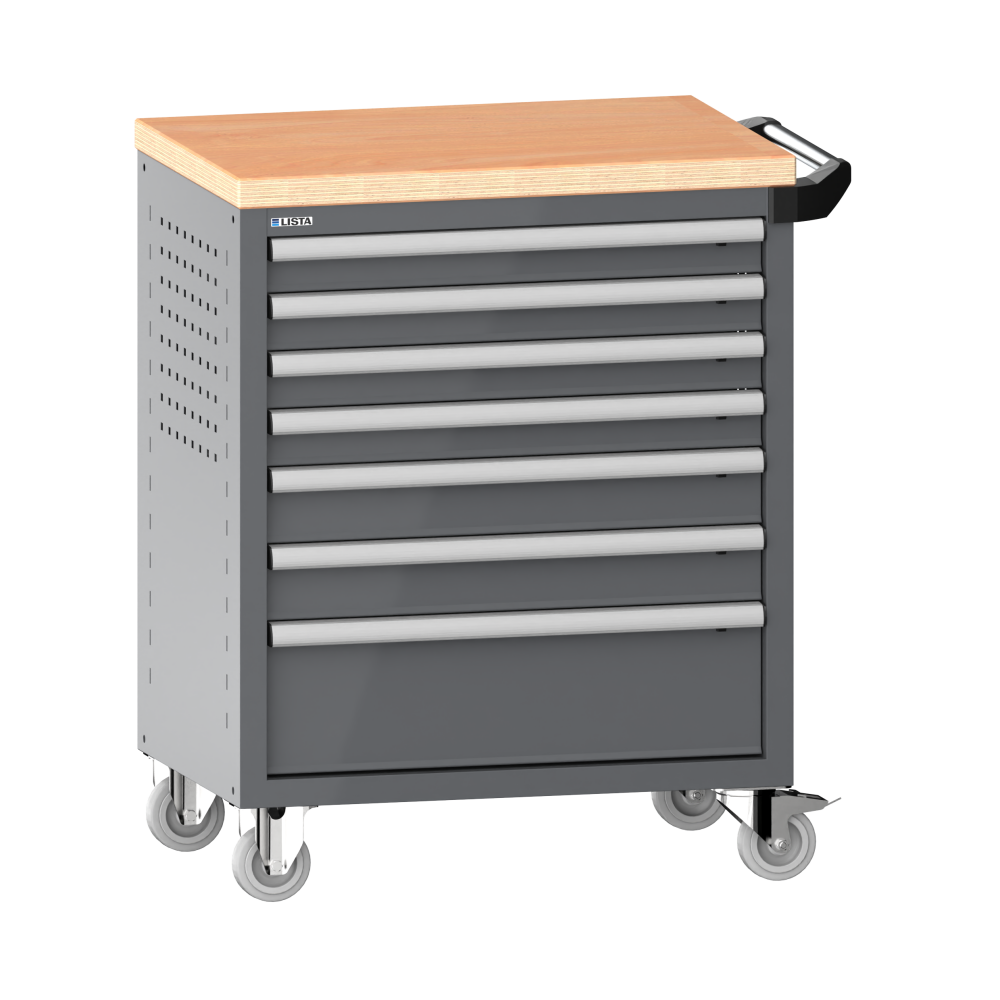 Werkstattwagen 36x27E (BxTxH) 833x525x945mm 7 Schubladen (4x75/2x100/1x200) 40kg mit Holzabdeckung Einzelsicherung rechts KEY Lock Grau metallic NCS S 6502-B