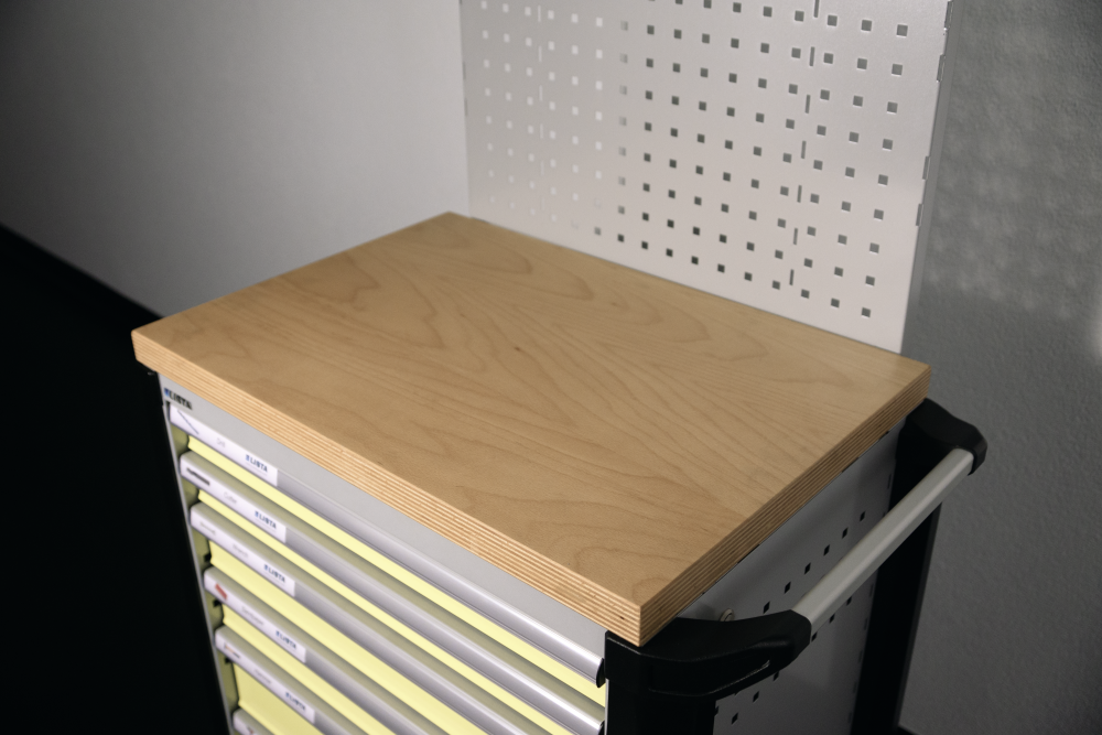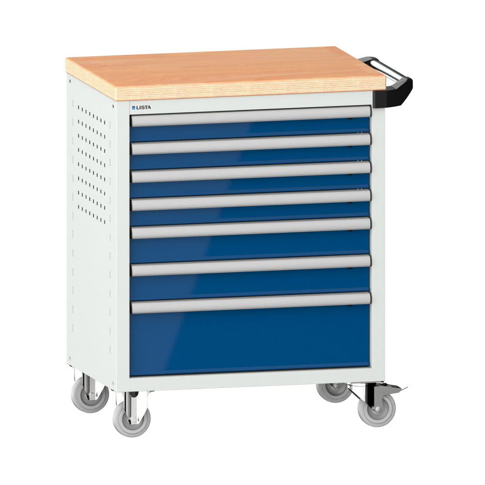 Werkstattwagen 36x27E (BxTxH) 833x525x945mm 7 Schubladen (4x75/2x100/1x200) 40kg mit Holzabdeckung Einzelsicherung rechts KEY Lock Lichtgrau RAL 7035 / Signalblau RAL 5005