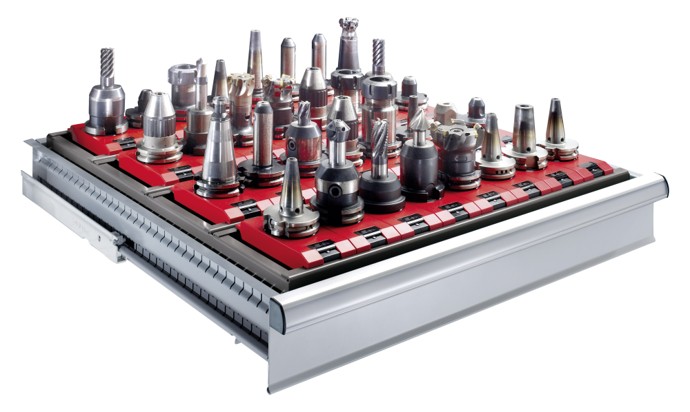Einsatzrahmen und Rahmenträgerpaare: Sind als Set oder Einzelkomponenten erhältlich. Pro Einsatzrahmen ist ein Rahmenträgerpaar erforderlich. Durch Rahmenträgerpaare in verschiedenen Höhen, die mit den Einsatzrahmen auf dem gelochten Schubladenboden verschraubt werden, lassen sich Werkzeuge unterschiedlicher Kegellängen in Schubladen lagern.