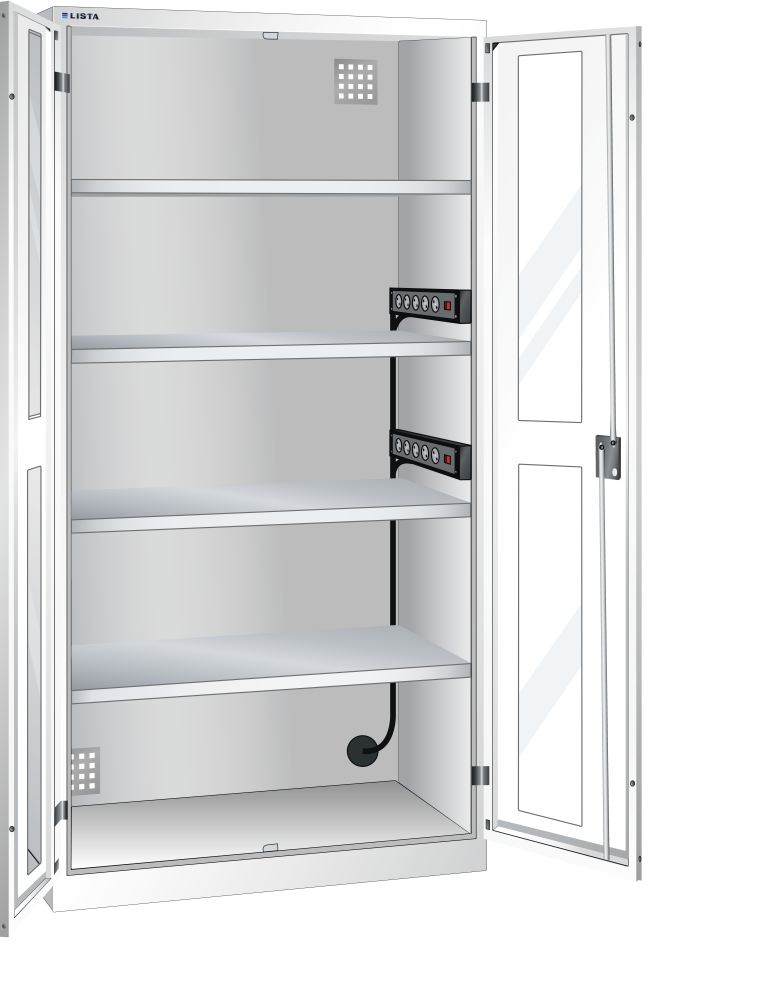 Battery charging cabinets with hinged doors: Depending on the model, the cabinets are equipped with: galvanised adjustable shelves, 30 mm thick, load capacity 60 kg. Drawers painted, anthracite grey (RAL 7016), load capacity 50 kg. Power strips with on/off switch and 4 or 5 sockets, 230 V.