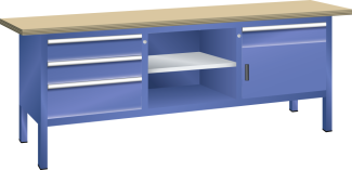 Compact workbench (WxDxH) 2000x700x850mm 1 hinged door, 3 shelves, 4 drawers, beech KEY Lock Signal blue RAL 5005