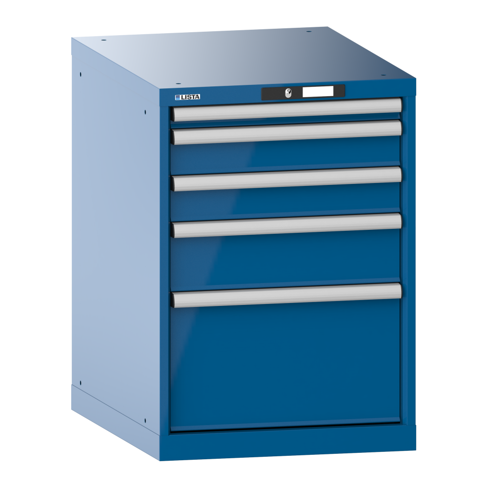 Drawer cabinet 27x36E (WxDxH) 564x725x800mm 5 drawers (1x50/2x100/1x150/1x300) 75kg KEY Lock Capri blue RAL 5019