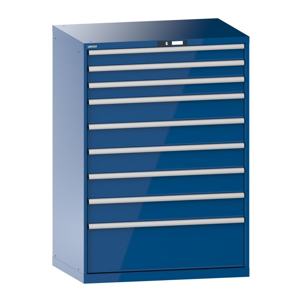 Drawer cabinet 54x36E (WxDxH) 1023x725x1450mm 9 drawers (3x100/5x150/1x300) 200kg KEY Lock Signal blue RAL 5005