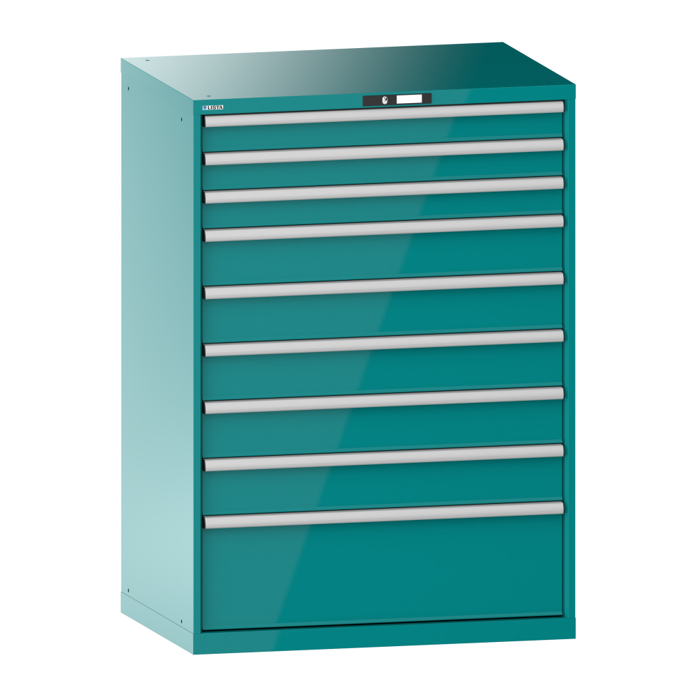 Drawer cabinet 54x36E (WxDxH) 1023x725x1450mm 9 drawers (3x100/5x150/1x300) 200kg KEY Lock Turquoise blue RAL 5018