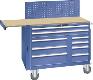 Drawer cabinet Toolbox mobile 64x27E (WxDxH) 1193x630x1450mm 9 drawers (64x27E: 2x100, 36x27E: 2x150/1x200, 18x27E: 2x150/2x100) 75kg rubber castors Ø160mm KEY Lock Gentian blue RAL 5010