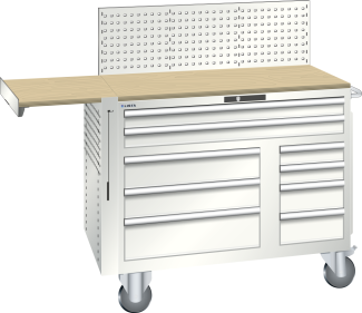 1 Multiplex cover panel 30 mm, 1 push bar, 1 pair of castor supports with rubber castors Ø 160 mm, 1 folding worktop, 1 perforated rear panel, 1 perforated side panel