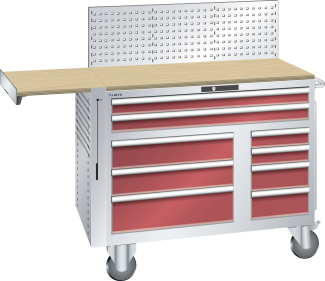 Drawer cabinet Toolbox mobile 64x27E (WxDxH) 1193x630x1450mm 9 drawers (64x27E: 2x100, 36x27E: 2x150/1x200, 18x27E: 2x150/2x100) 75kg rubber castors Ø160mm KEY Lock Light grey RAL 7035 / Ruby red RAL 3003
