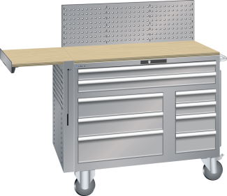 1 Multiplex cover panel 30 mm, 1 push bar, 1 pair of castor supports with rubber castors Ø 160 mm, 1 folding worktop, 1 perforated rear panel, 1 perforated side panel
