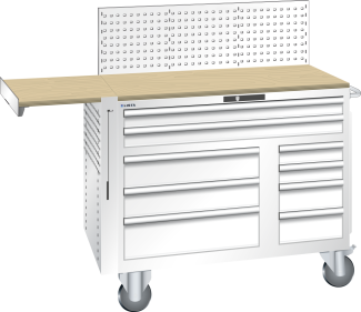 Drawer cabinet Toolbox mobile 64x27E (WxDxH) 1193x630x1450mm 9 drawers (64x27E: 2x100, 36x27E: 2x150/1x200, 18x27E: 2x150/2x100) 75kg rubber castors Ø160mm KEY Lock Pure white RAL 9010