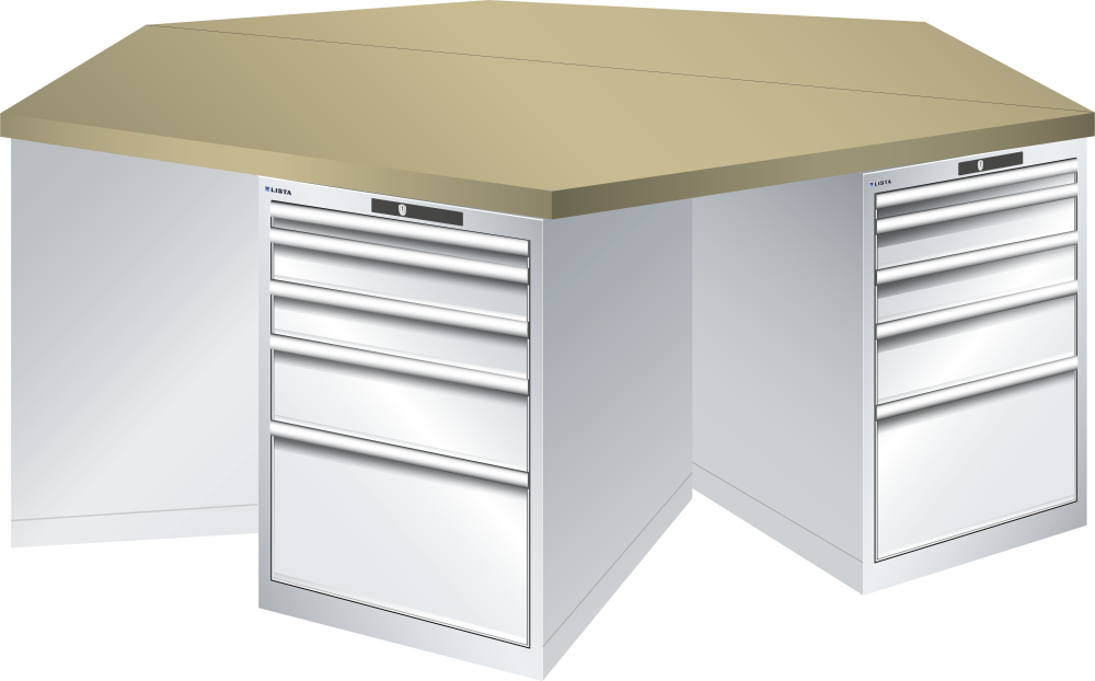 Hexagonal Workbench 27x36E (WxDxH) 2500x2165x840mm 6 x 5 drawers (1x50/2x100/1x150/1x300) 75kg Multiplex CODE Lock, colour as described (individual colour request)