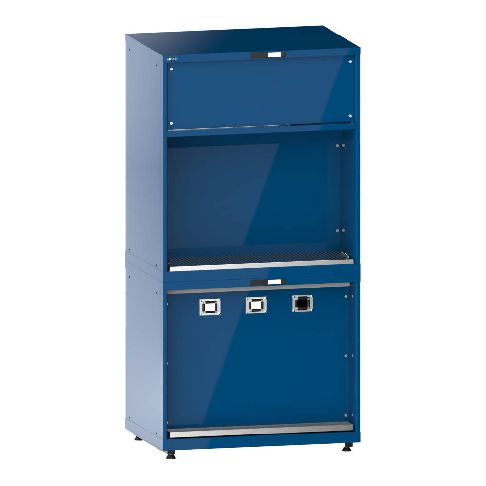 Media supply tower 54x36E (WxDxH) 1023x725x2045-2090mm 6 x hose ports/2 x drip tray incl. levelling foot set for covers (4 x feet, 45-90mm) and mounting set Gentian blue RAL 5010