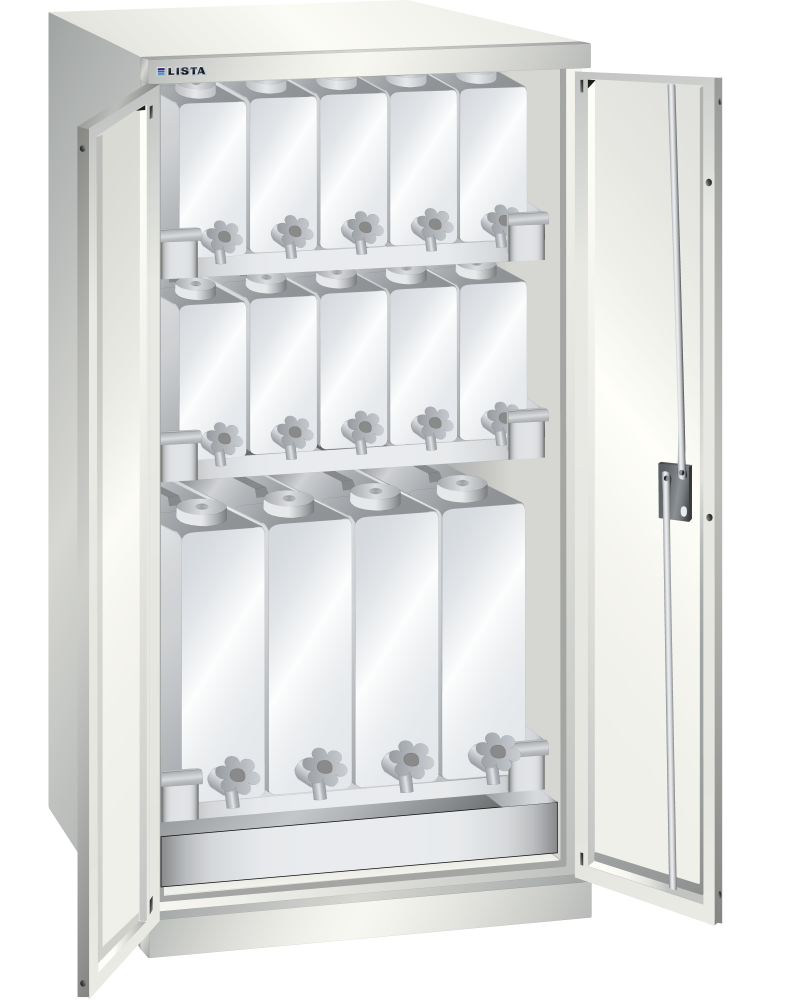 Oil cabinets: The cabinets are fitted with: chrome steel drip trays, 2 mm thick, welded to form a liquid-tight seal according to Section 19 of the Water Resources Act/German directive on steel trays (StawaR), 40-litre capacity, canister shelves (painted grey), NCS 4502-B, canister made of HDPE plastic with outlet valve (glossy chrome finish). Solid-sheet hinged doors folded from one piece, with fulcrum pins, 235° opening angle.
