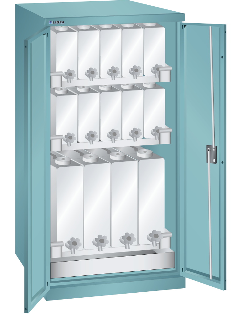 Oil cabinets: The cabinets are fitted with: chrome steel drip trays, 2 mm thick, welded to form a liquid-tight seal according to Section 19 of the Water Resources Act/German directive on steel trays (StawaR), 40-litre capacity, canister shelves (painted grey), NCS 4502-B, canister made of HDPE plastic with outlet valve (glossy chrome finish). Solid-sheet hinged doors folded from one piece, with fulcrum pins, 235° opening angle.