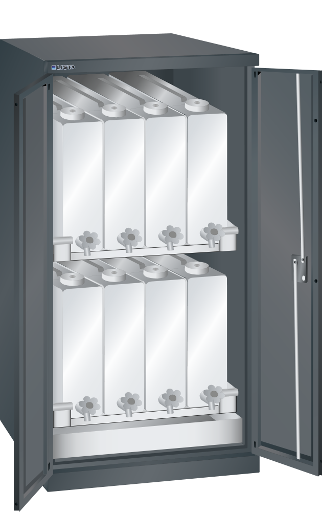 Oil cabinets: The cabinets are fitted with: chrome steel drip trays, 2 mm thick, welded to form a liquid-tight seal according to Section 19 of the Water Resources Act/German directive on steel trays (StawaR), 40-litre capacity, canister shelves (painted grey), NCS 4502-B, canister made of HDPE plastic with outlet valve (glossy chrome finish). Solid-sheet hinged doors folded from one piece, with fulcrum pins, 235° opening angle.