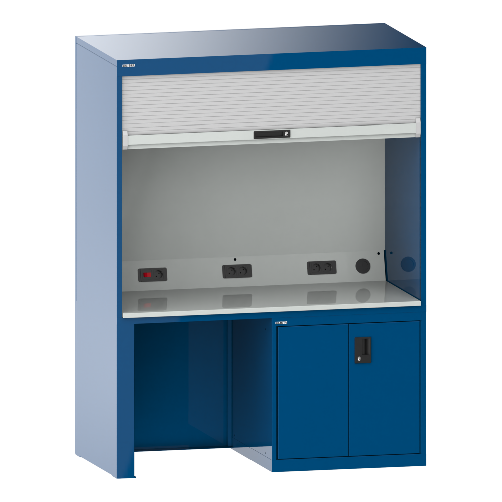 Quality cabinet: With plastic roller shutters including cylinder lock, connection cable 3 m long, hard laminate top as working surface, fitted without tools, power supply with 4-socket or 5-socket power outlet and rocker switch for the lamp built into the housing cover