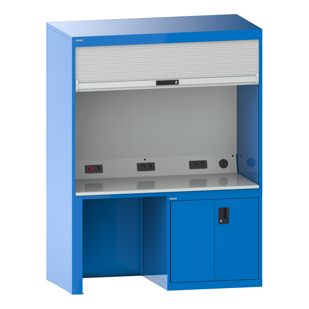 Quality cabinet: With plastic roller shutters including cylinder lock, connection cable 3 m long, hard laminate top as working surface, fitted without tools, power supply with 4-socket or 5-socket power outlet and rocker switch for the lamp built into the housing cover