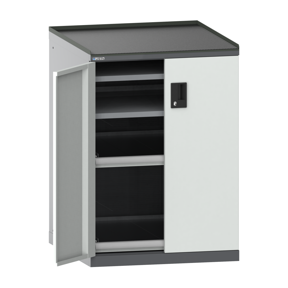 Puertas batientes: las puertas batientes de chapa de acero incorporan un cierre de barra de dos puntos y opcionalmente se pueden equipar con los sistemas de cierre KEY Lock, CODE Lock o RFID Lock. El ángulo de abertura máximo es 235 grados.