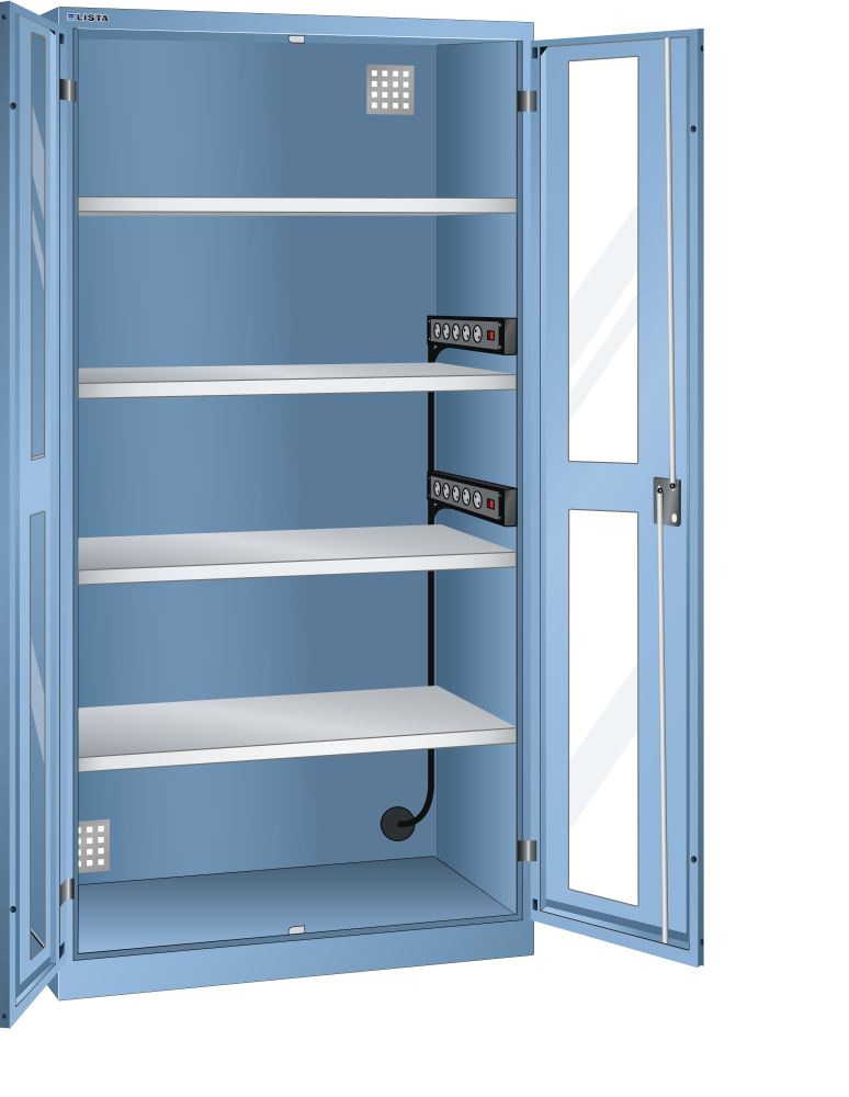 Armarios de carga con batería y puertas batientes: los armarios están equipados según el modelo con: estantes regulables galvanizados, 30 mm grosor, capacidad de carga 60 kg. Cajones lacados, gris antracita (RAL 7016), capacidad de carga 50 kg. Regletas de bornes con interruptor de conexión/desconexión y 4 o 5 enchufes de 230 V.