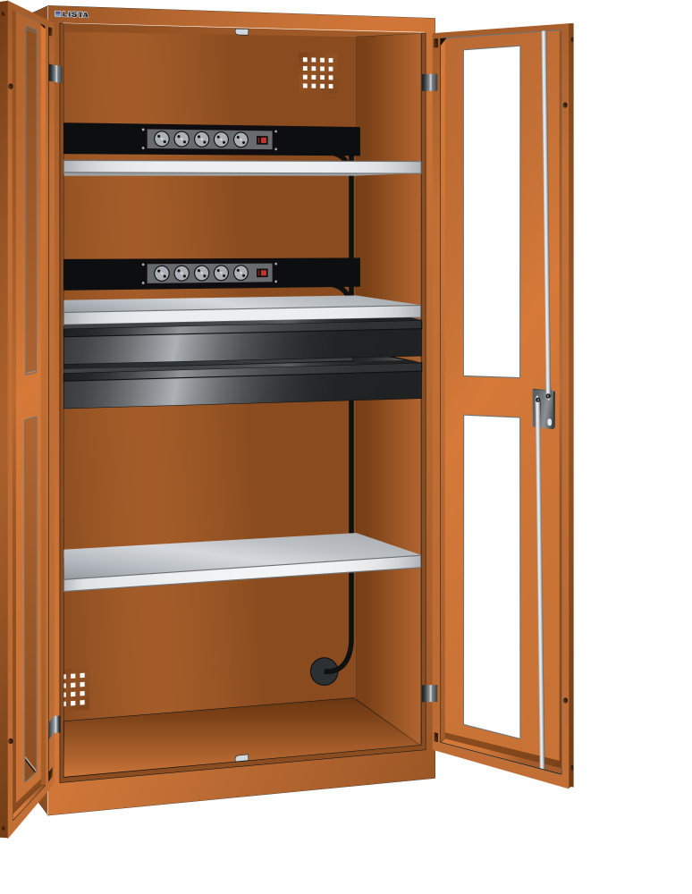 Armarios de carga con batería y puertas batientes: los armarios están equipados según el modelo con: estantes regulables galvanizados, 30 mm grosor, capacidad de carga 60 kg. Cajones lacados, gris antracita (RAL 7016), capacidad de carga 50 kg. Regletas de bornes con interruptor de conexión/desconexión y 4 o 5 enchufes de 230 V.