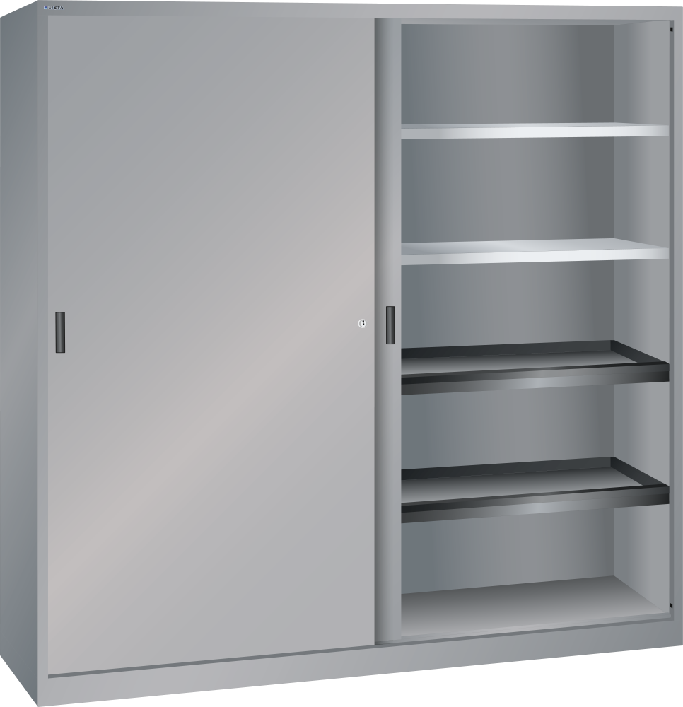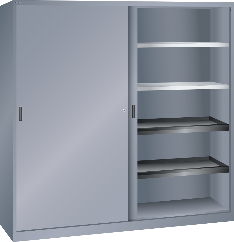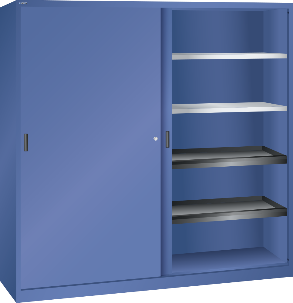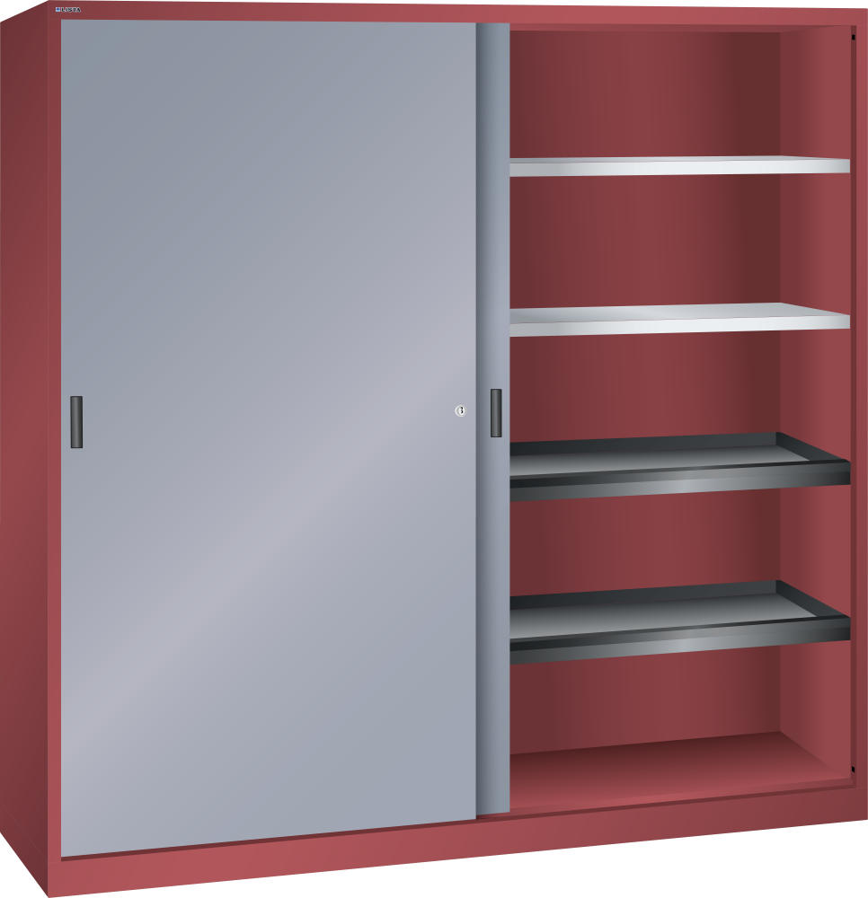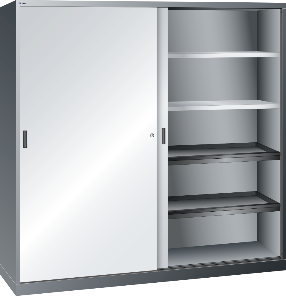 Armarios de puertas correderas: los armarios están equipados según el modelo con: estantes regulables galvanizados, 30 mm grosor, capacidad de carga 60 kg. Los estantes extensibles y los cajones están lacados, gris antracita, RAL 7016, capacidad de carga de 50 kg