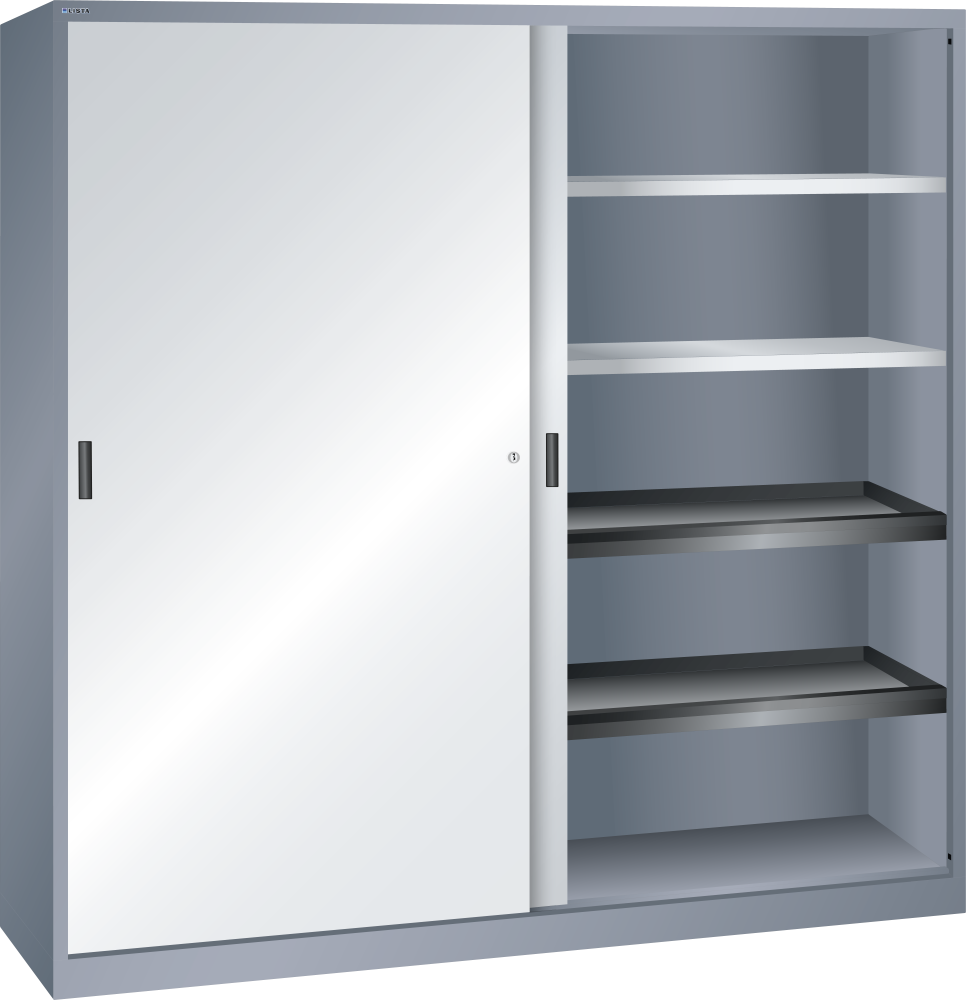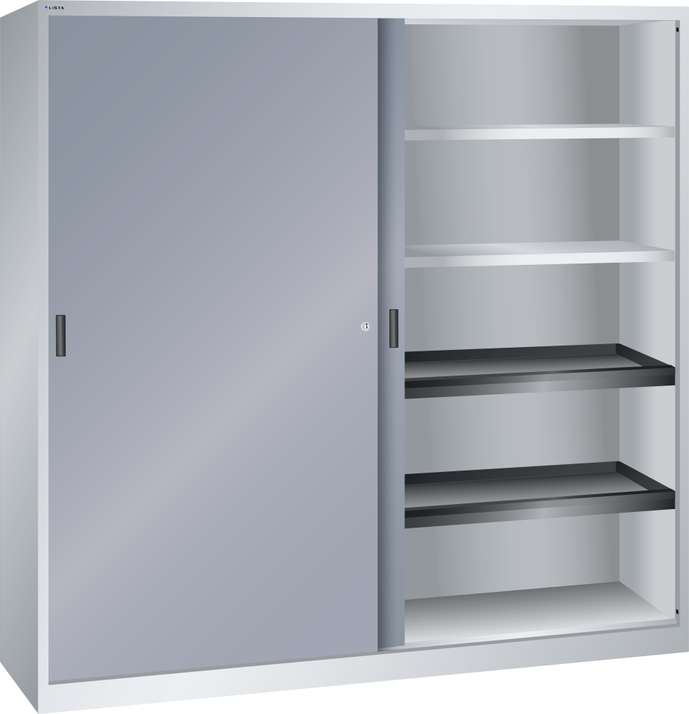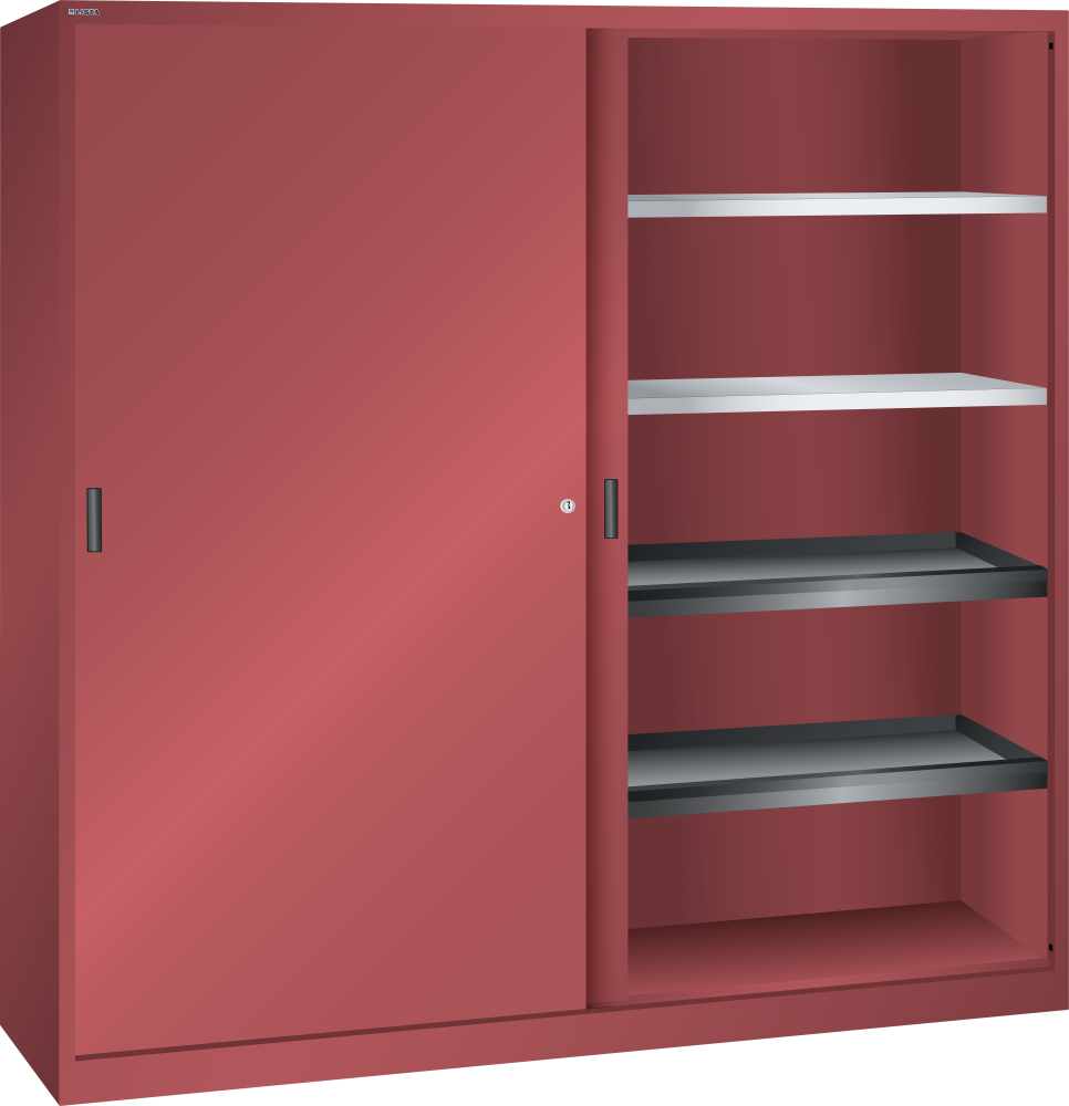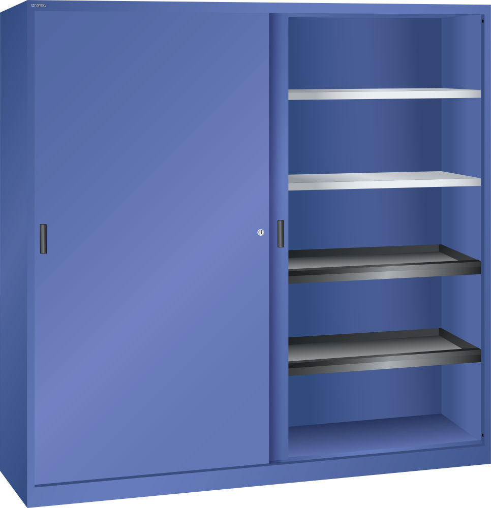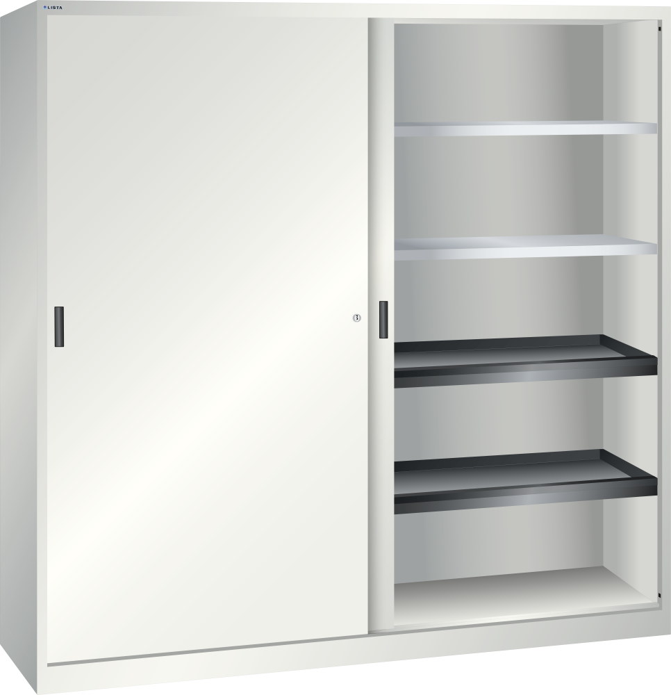 Armarios de puertas correderas: los armarios están equipados según el modelo con: estantes regulables galvanizados, 30 mm grosor, capacidad de carga 60 kg. Los estantes extensibles y los cajones están lacados, gris antracita, RAL 7016, capacidad de carga de 50 kg