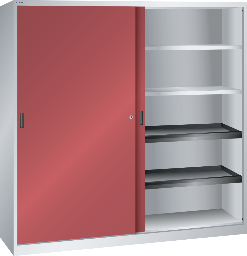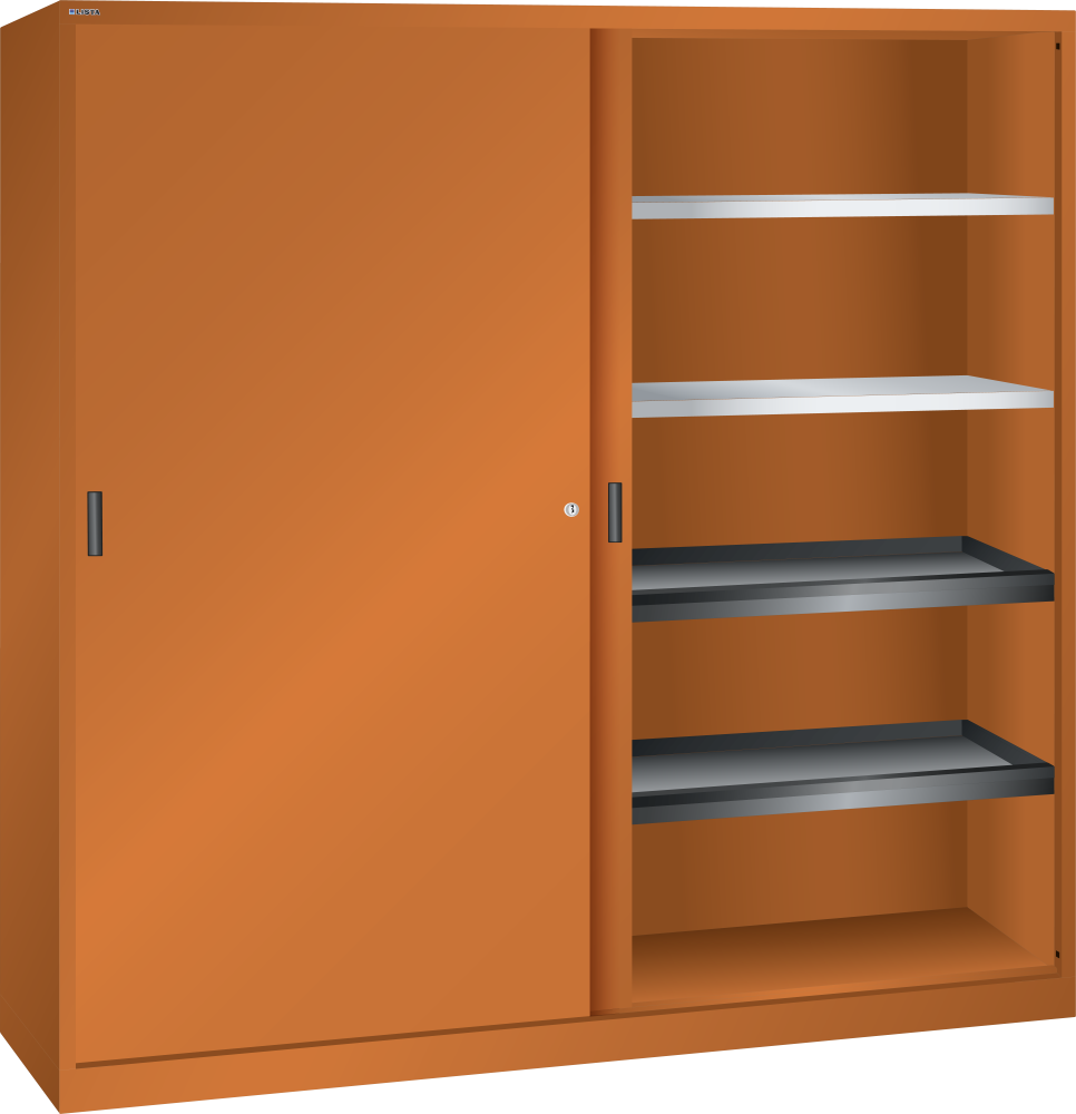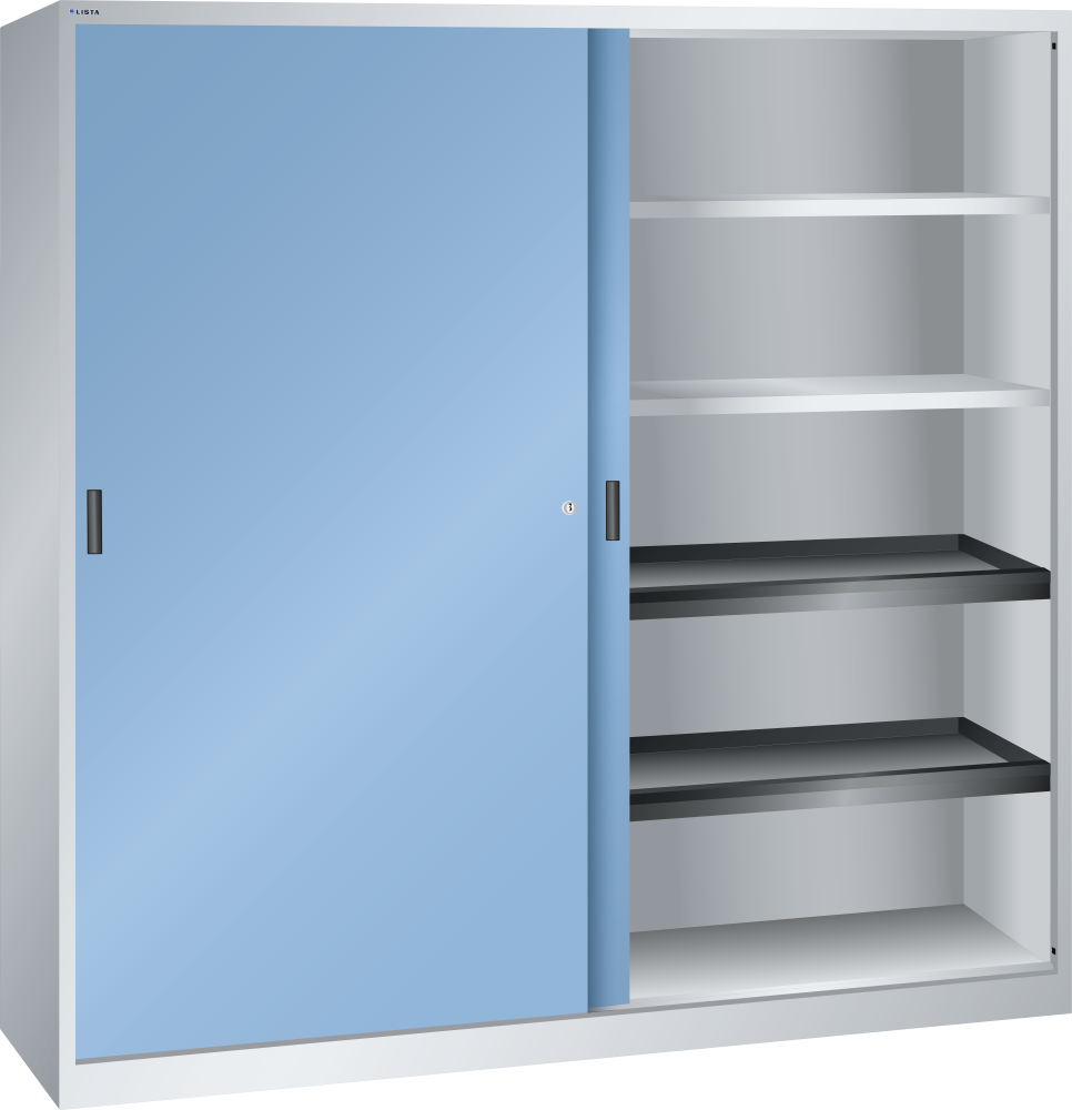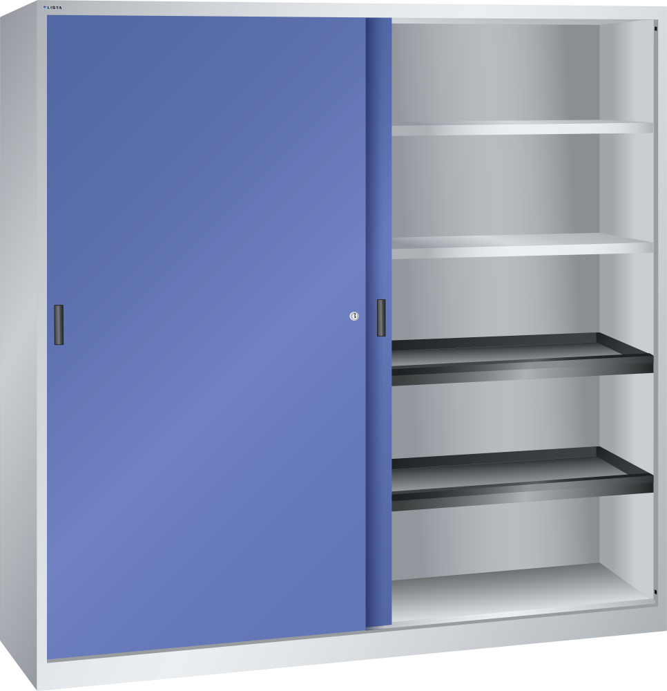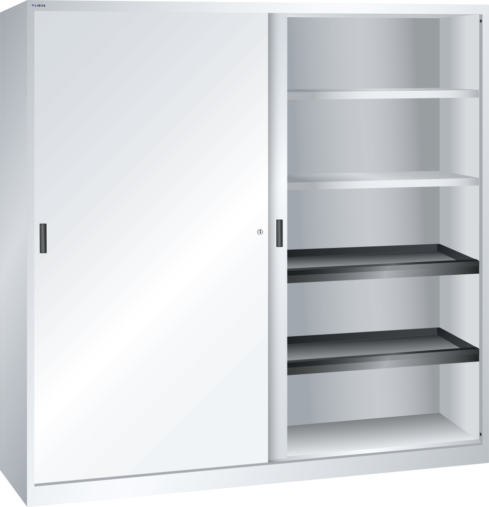 Armarios de puertas correderas: los armarios están equipados según el modelo con: estantes regulables galvanizados, 30 mm grosor, capacidad de carga 60 kg. Los estantes extensibles y los cajones están lacados, gris antracita, RAL 7016, capacidad de carga de 50 kg