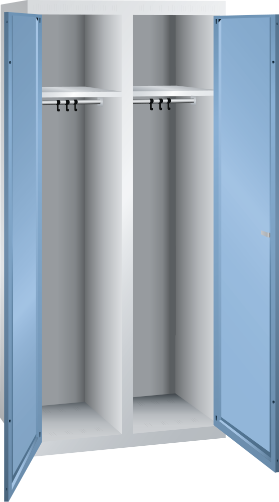 Armarios guardarropa: los armarios guardarropa están equipados según el compartimento y modelo con: 2 puerta de chapa maciza batiente enclavada, superficie lisa o con módulo perforado para una ventilación adicional (2 compartimento de cierre / 1 cerradura para 2 compartimentos), balda para sombreros, perchero con tres ganchos de ropa desplazables, un portatoallas.