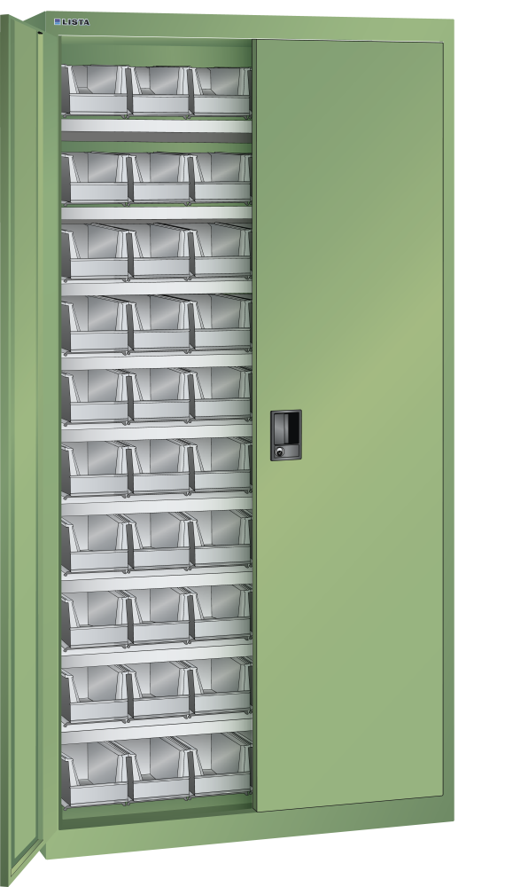 Main URL: https://app.lista.com/es/Armario-para-depositos-con-2-puertas-de-chapa-maciza-bisagra-AxPxA-1000x300x1950mm-9-estantes-regulables-60-contenedores-plasticos-KEY-Lock-Verde-reseda-RAL-6011-3019709.html