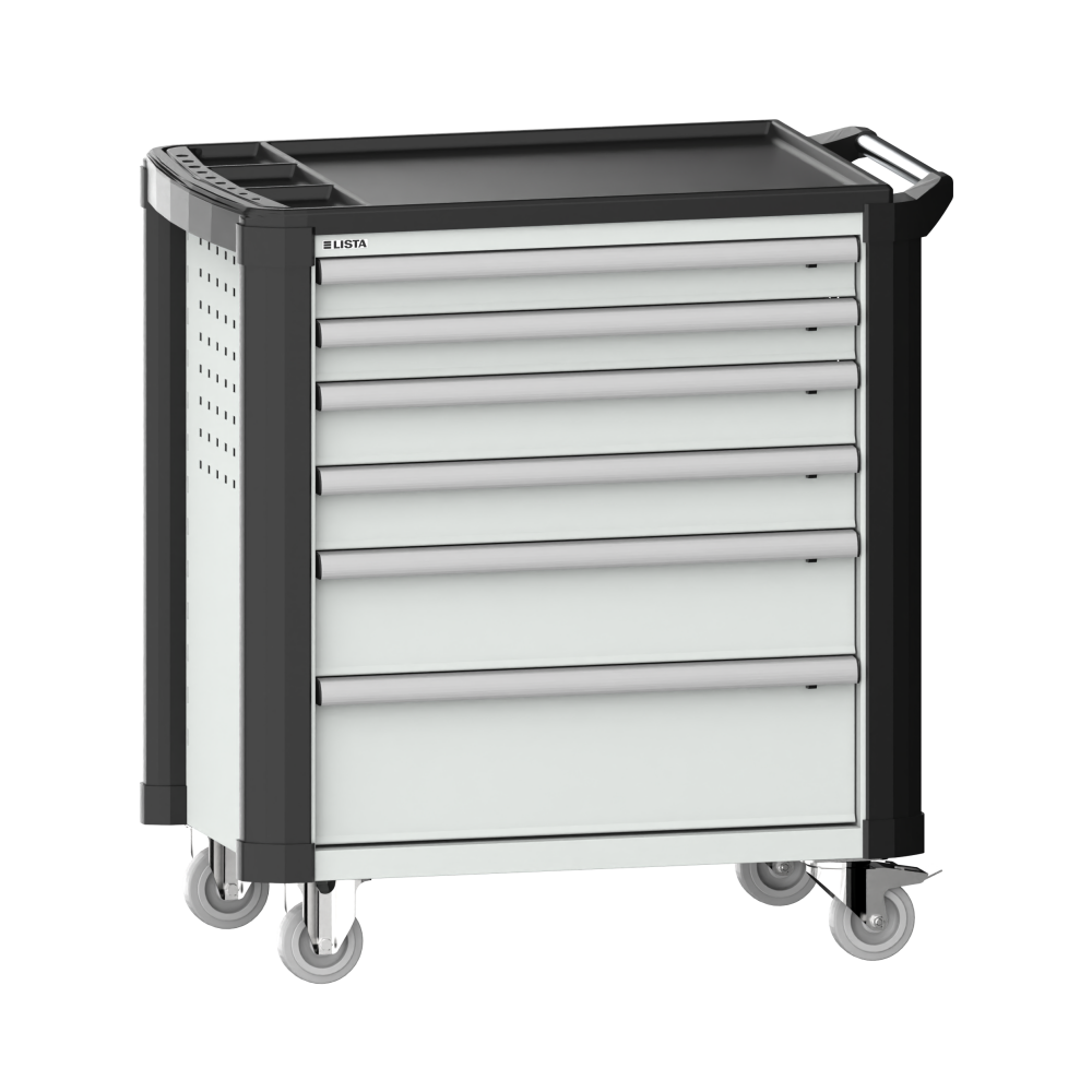Carro de taller 36x27E (AxPxA) 894x525x928mm 6 cajones (2x75/2x100/1x150/1x200) 40kg con cubierta de plástico y protección de esquinas retén de seguridad sencillo a la derecha KEY Lock Gris luminoso RAL 7035